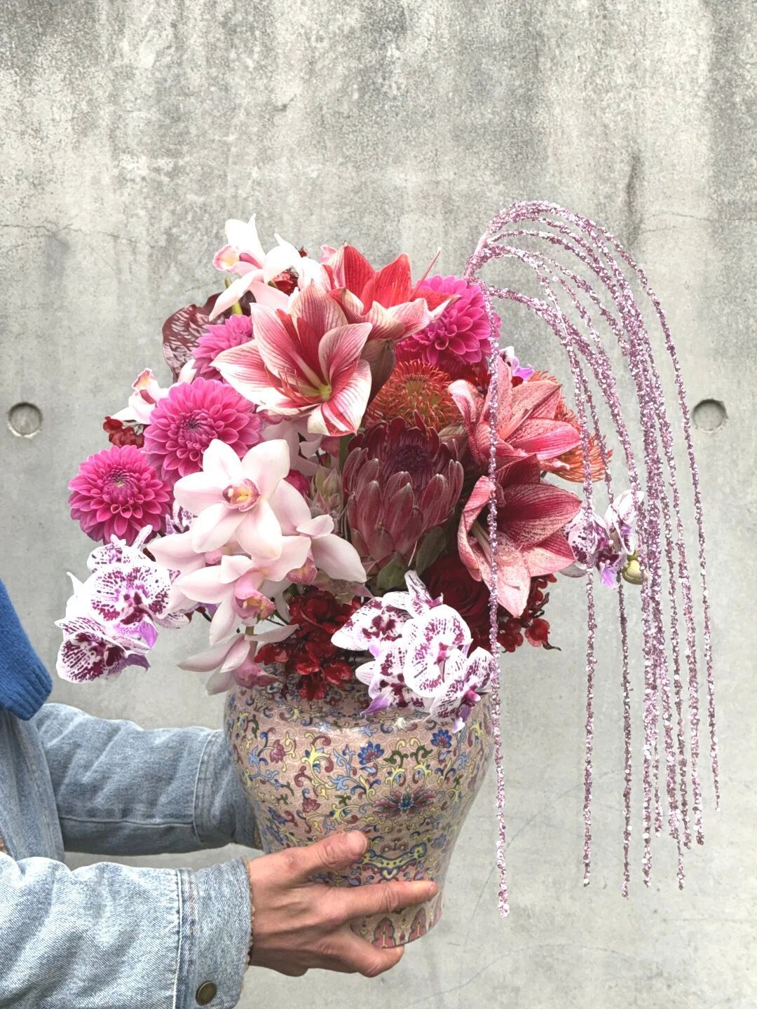 值得一提的是,花艺师选用了不少市面上少见的花材,并敏锐捕捉到节前恰逢情人节的市场热点,特别推出了粉色系甜美感的作品,深受年轻人喜爱。