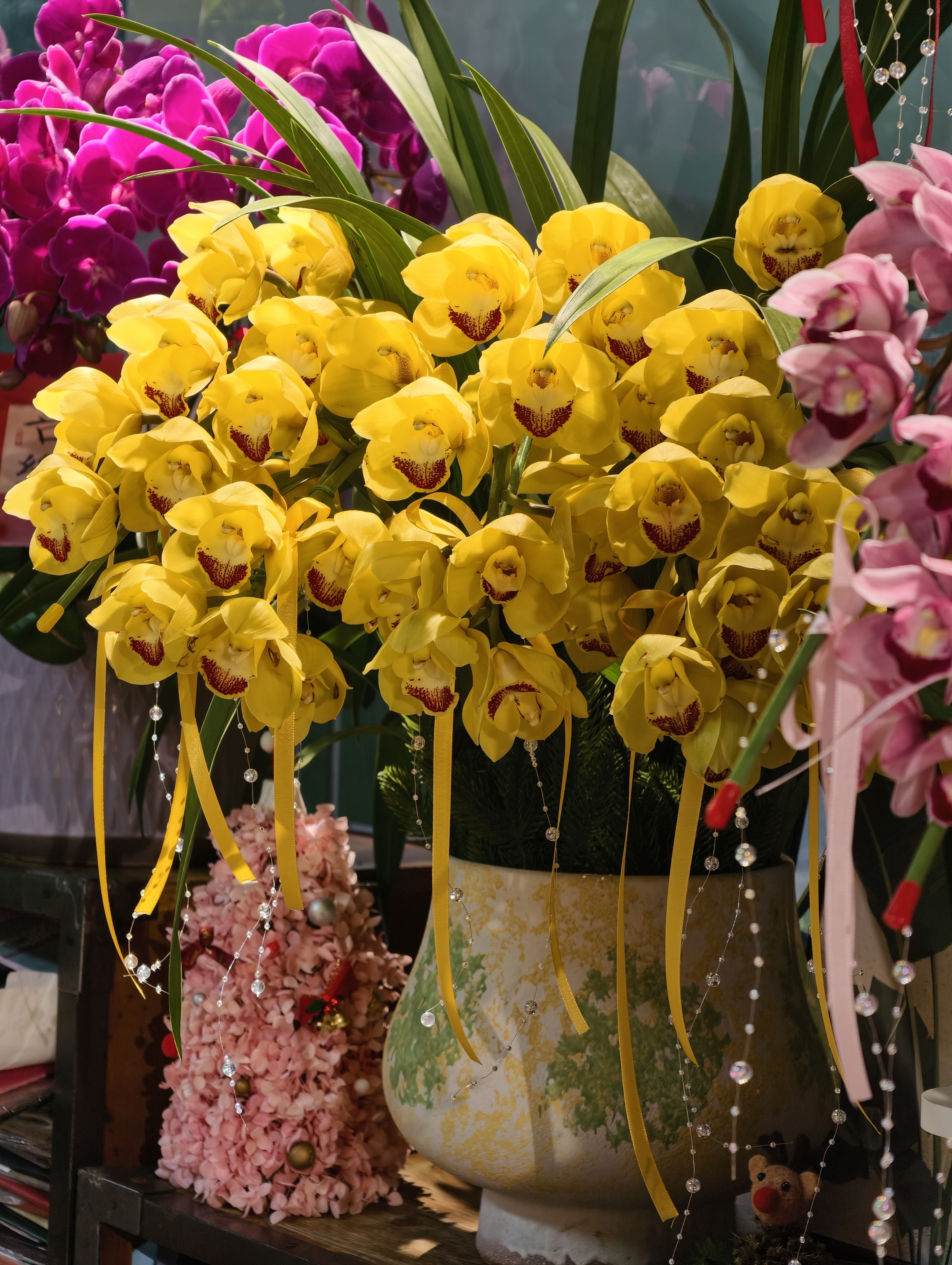 花艺师别出心裁,为雍容的大花蕙兰系上丝带与珠串,平添几分灵动仙气。蝴蝶兰、佛手、挂满“金果”的小金橘等,也供市民随意挑选。