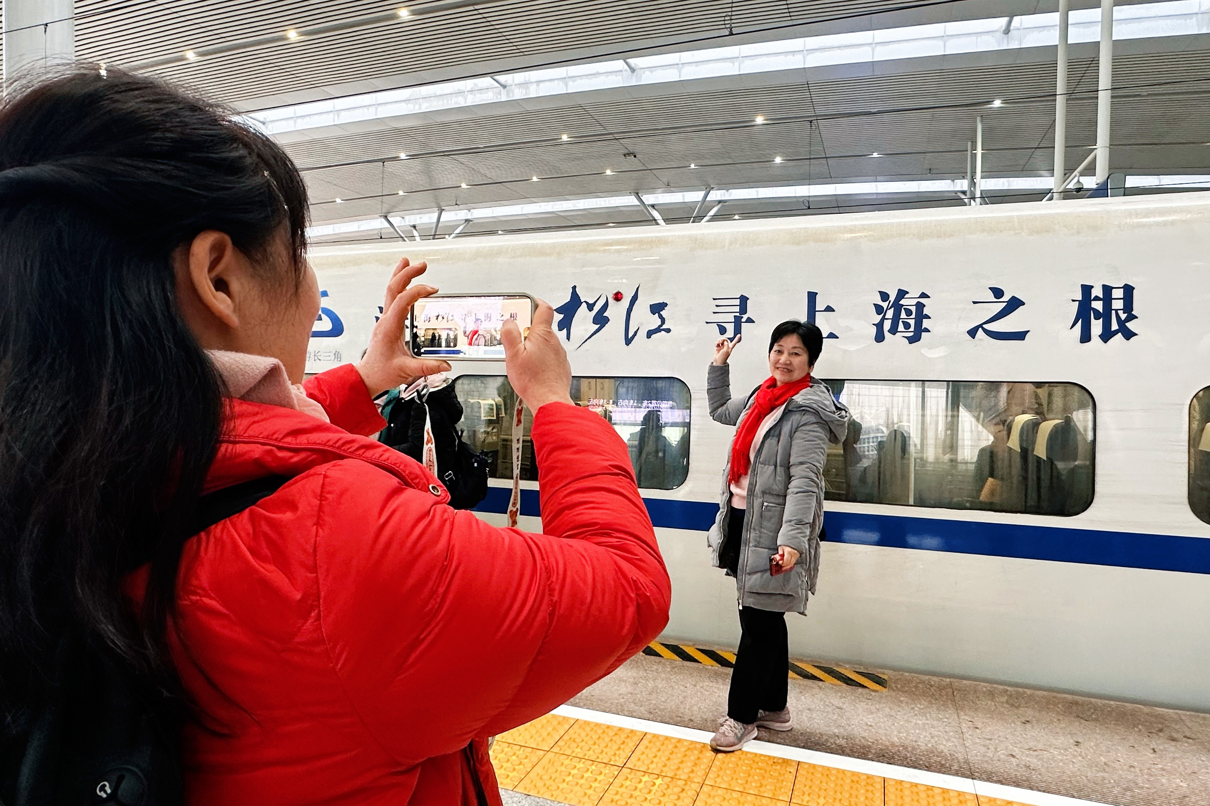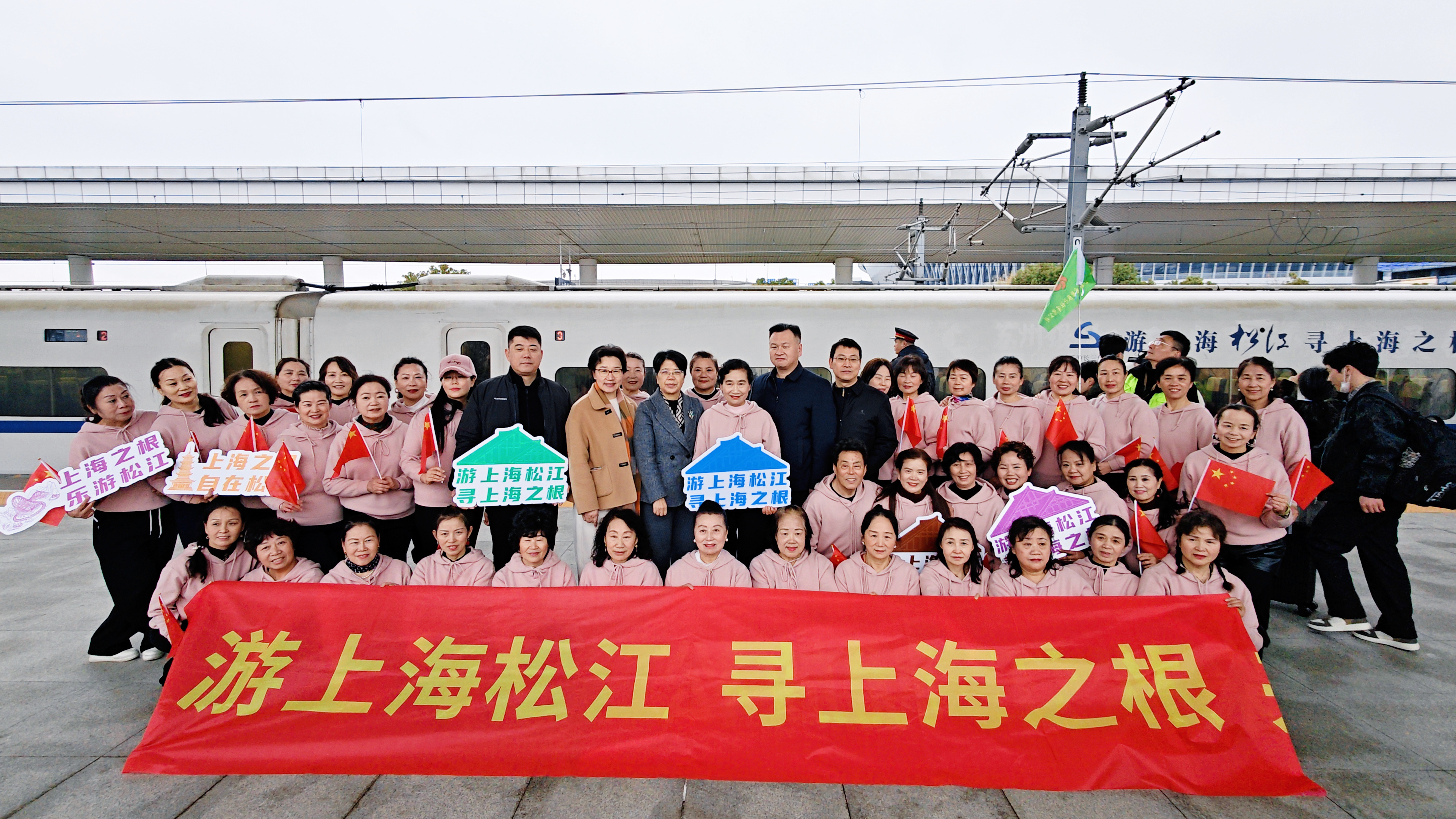 服务中心启用仪式余温未散,一场充满欢快与期待的旅程随即展开。8时30分,首发团游客及嘉宾有序前往上海松江站南区2号站台,大家手持宣传手牌、共同拉起主题横幅,在镜头前留下灿烂笑脸,现场气氛热烈温馨。“松江历史底蕴深厚,这次特意报名首发团,还参观了这么现代化的服务中心,感觉旅行从一开始就充满惊喜!”首发团游客周龙珍展示着手中的文创礼品,对此次旅程满怀期待。