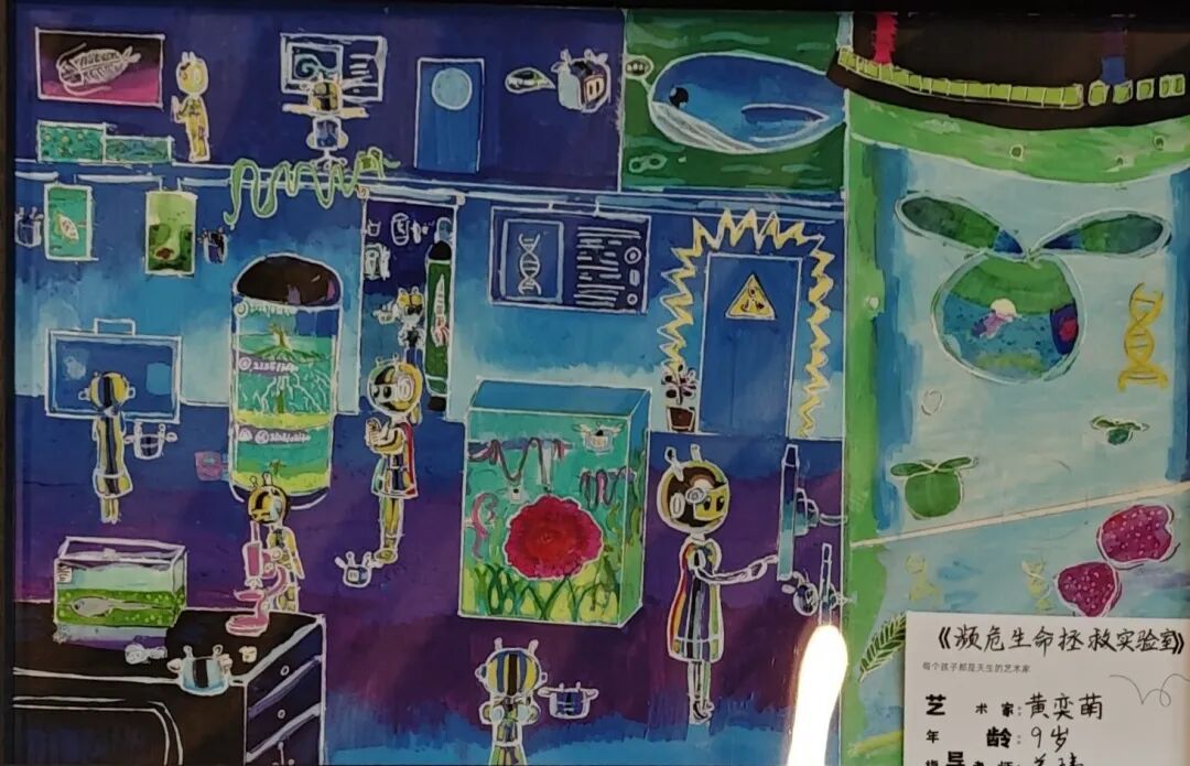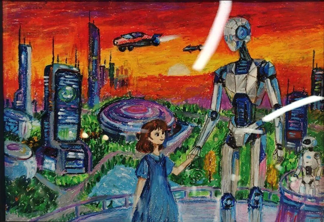 在孩子们的作品中,AI化作陪伴老人阅读的温暖光影,算法像是星光洒落,照亮了童真的梦境。与此同时,部分作品也展现出初步的批判视角,被数据缠绕的人物、充满疑问的眼神等艺术元素中,透露出小作者对隐私、伦理与人机关系的思考。