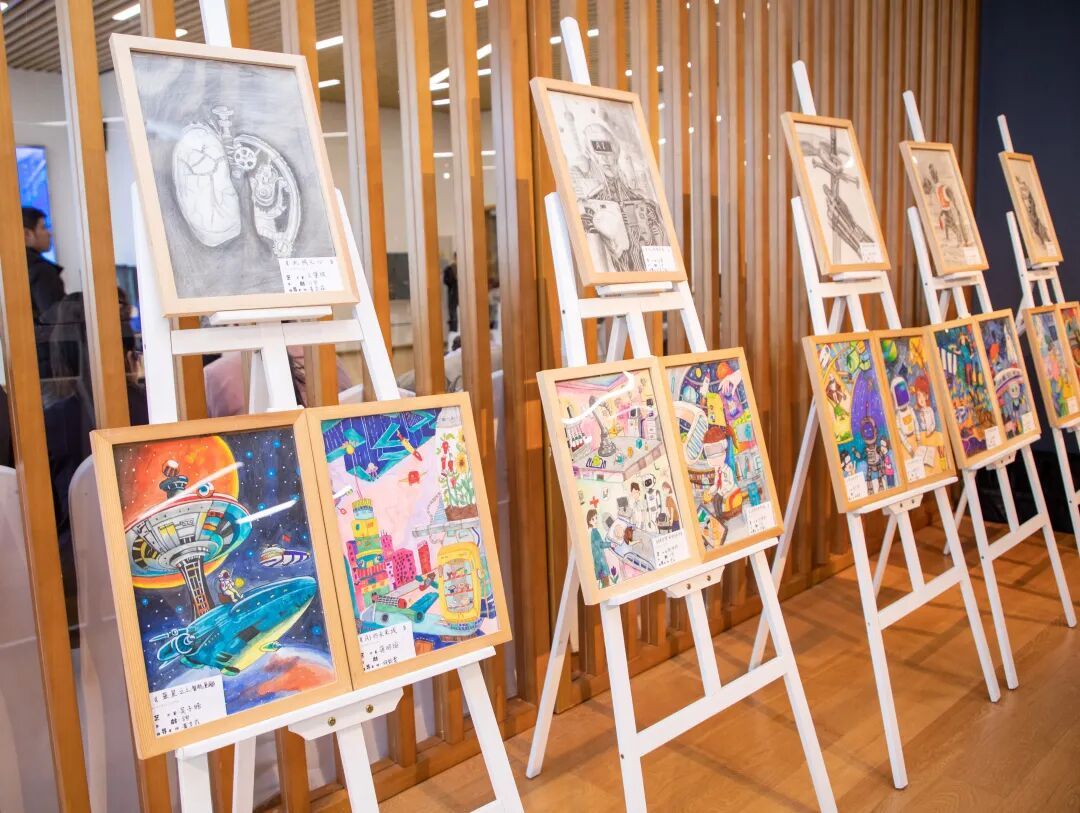 1月31日下午,“百廿智见·AI创想家”公益绘画艺术展在海派艺术馆正式启幕。展览汇集了明强小学学生围绕人工智能主题创作的120幅手绘作品,以纯真的视角,展开对科技未来的想象与思辨,呈现出一场视觉与思想交织的“未来一课”。