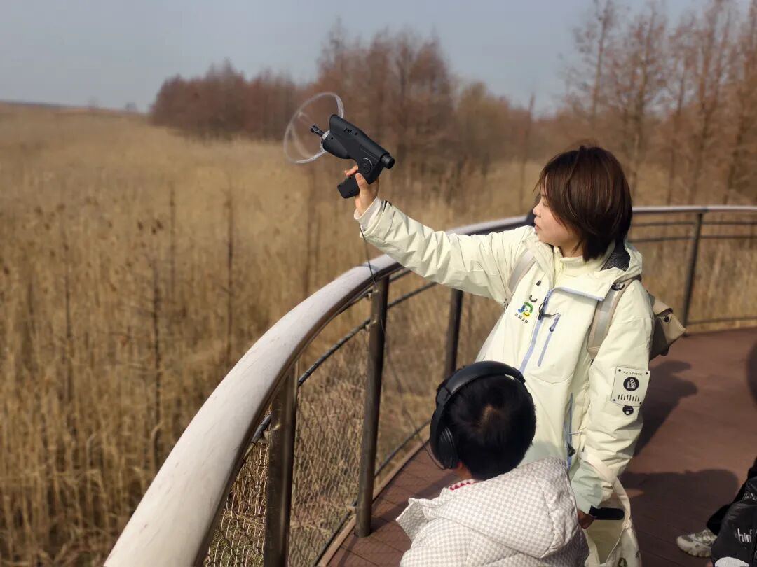 活动现场,专业讲解员带领参与者深入湿地,通过专业设备观鸟,聆听虫鸟鸣声,沉浸式感受湿地中生命的鲜活与自然的包容。“在学校一直待在教室,根本看不见这么多鸟类,这次来认识了很多鸟,也知道了它们的名字,比如白鹭、斑鸠,还有很多鸟是国家二级保护动物,我觉得很有趣。”一位学生兴奋地说。