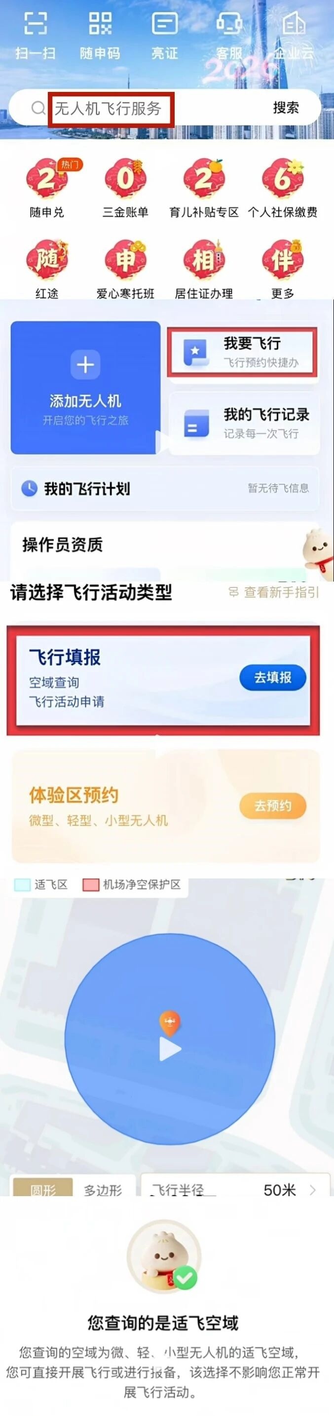 在服务页面看实时空域图:绿色是适飞区!每次起飞前都建议查一下,避免临时管控!