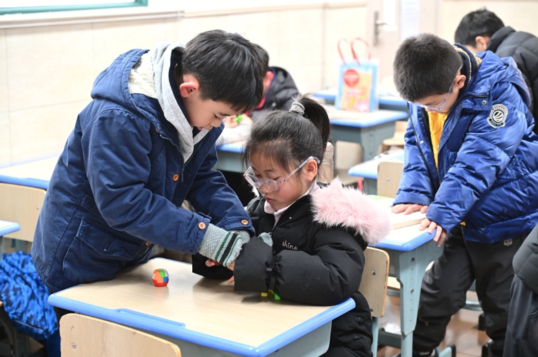 清晨签到、课间看护、午餐分发、放学交接……全方位保障,细致入微。活动期间,每间教室配备三名志愿者全程在后方值守,配合教师维护秩序并及时提供协助。每一个环节都有志愿者们忙碌的身影,他们确保孩子们吃上热乎饭菜,协助组织有序活动,直至最后一位孩子安全交至家长手中。放学后,清洁消毒、复盘总结,为翌日的工作做足准备。志愿者顾畅源感慨颇深:“寒托班开班首日,我负责引导孩子们完成签到、晨检与主题拍照,这看似简单的流程,却让我感受到小细节里的大温暖。”