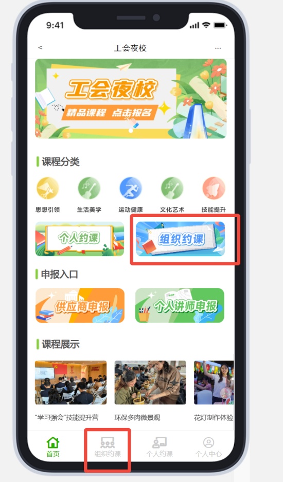 1.进入“工会夜校”小程序,点击“组织约课”版块,同时底部导航栏也有单独入口;