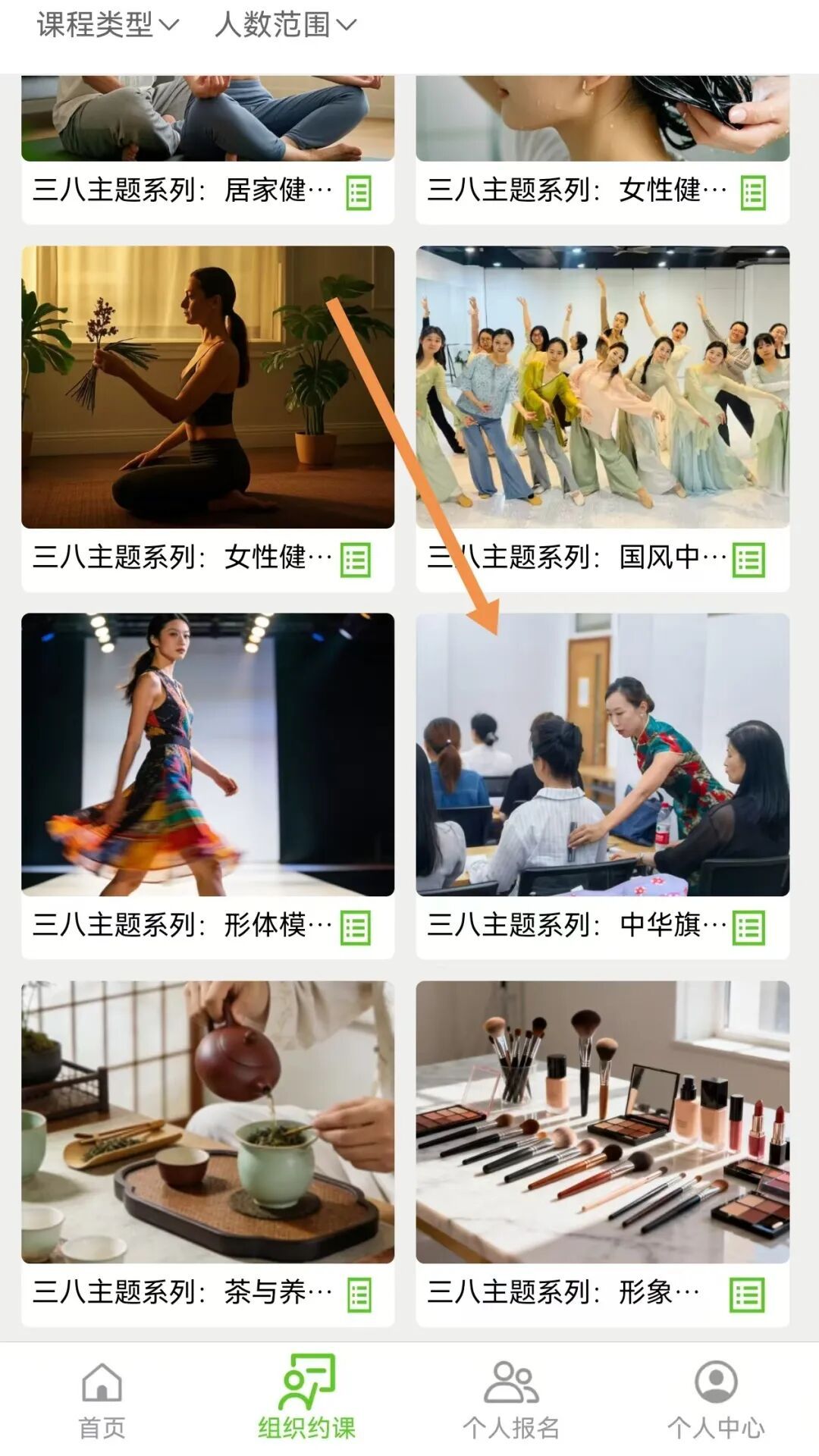 2.进入组织预约申请,选择想预约的“三八主题系列”课程,点击进入查看“课程详情”;