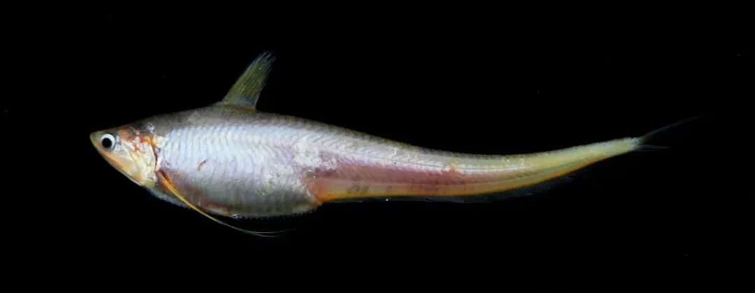 体延长,前部呈圆筒形,后部逐渐侧扁;头宽吻短,鼻孔每侧两个,位于眼上缘前方;眼周红色,背鳍青灰,腹侧灰白,上体侧有数条黑色纵纹。