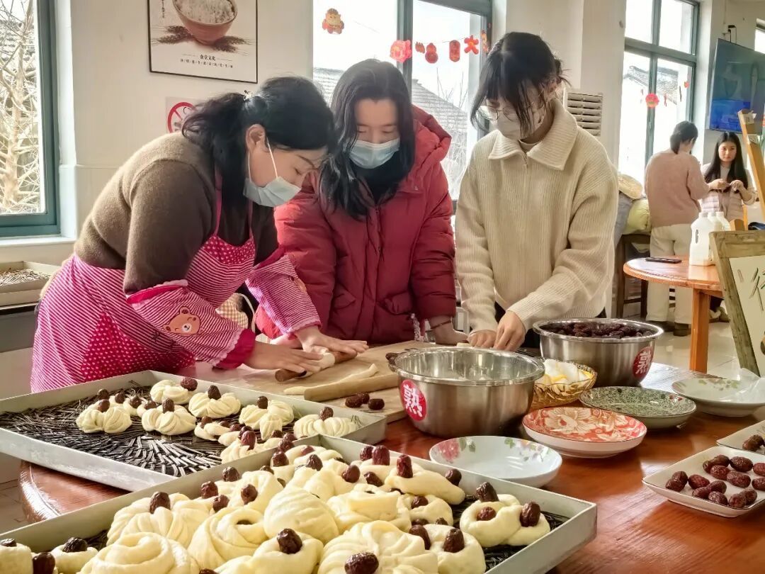 学校行政组教师张荣芳在山东长大,来松江工作已25年。当天,她带来了北方年俗——做枣花馍。只见她麻利地摊开提前发酵好的面团,用力揉搓排气,分成小剂子后,再用擀面杖擀成厚薄均匀的椭圆形饼皮,做成形状各异的馍,最后嵌上红枣。“去年我是在后厨忙活,孩子们看到的是成品;今年特地现场展示,让大家了解制作过程。”张荣芳说,虽说南北方年俗形式不同,但对新春的企盼和祝福都是相通的。