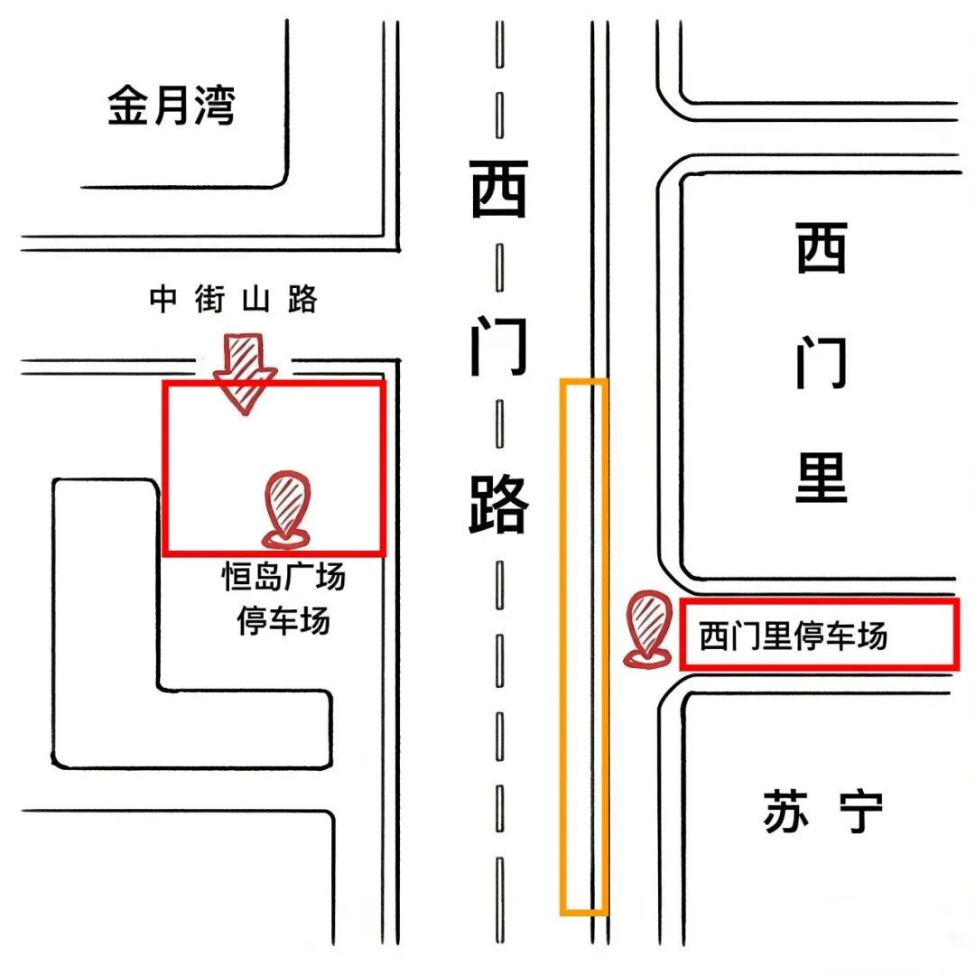 停车场入口为中街山路入口,地处广场北侧。(如下图左侧红框)3. 西门路临时停车(如下图黄框内区域,视情况开放。)双休日全天开放西门路双侧路边临时停车位;工作日停车资源饱和时,将依据现场实际情况,视情开放西门路单侧或双侧临时停车。具体请听从现场公安、安保力量指挥。非机动车可统一停放至西门路两侧上街沿非机动车专属停车位,其中东侧停车位可有序双排停放,请勿占用行人步道及机动车道,保障道路通行畅通。活动期间人流量、车流量较大,建议优先选择公共交通、步行等绿色出行方式;自驾市民请从中街山路入口驶入恒岛停车场,服从现场工作人员指挥引导,有序停放、文明出行。