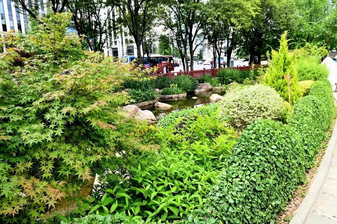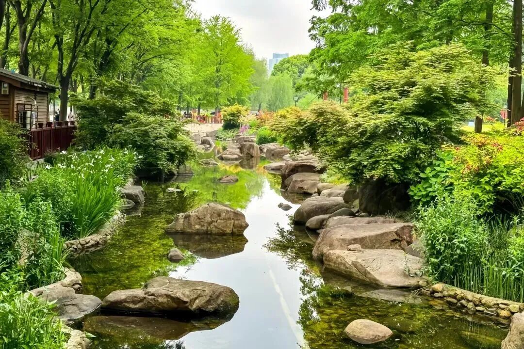 而在这张生态网络中,广场公园(黄浦段)无疑是最亮眼的一颗明珠。这座占地约23公顷的开放式都市公园,藏身于延安高架路南侧的闹市之中,以“蓝绿交融”为设计理念,将湖泊、溪流、水生植物巧妙串联,打造出一片闹中取静的湿地秘境。