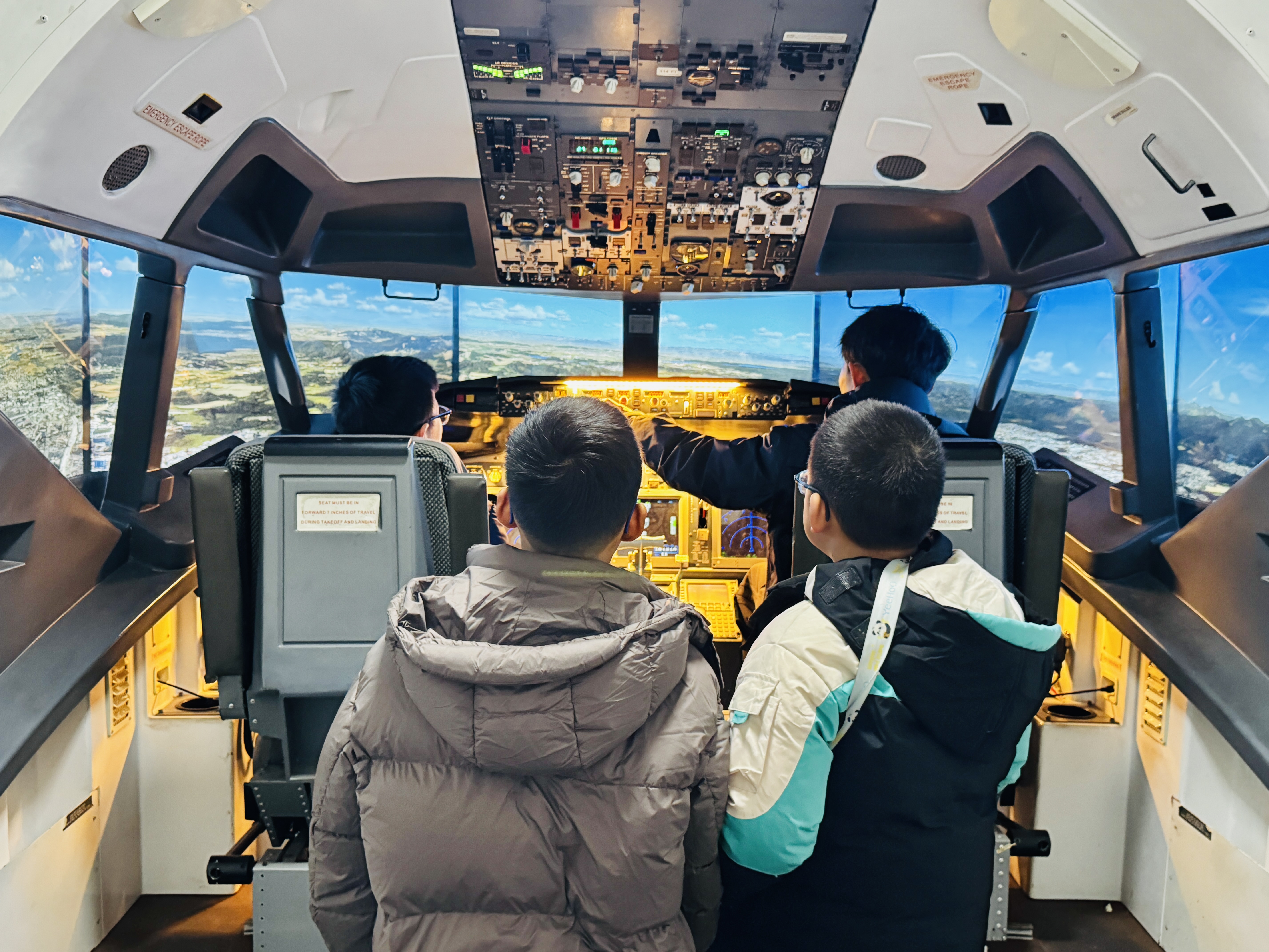 实践操作环节,孩子们在教练指导下手握遥控器,操控四轴飞行器完成升降、悬停、绕障等基础动作。经过反复尝试,不少孩子已能熟练操控无人机平稳穿过悬空圆环,脸上洋溢着成功的喜悦。一旁的模拟驾驶舱内同样热闹,小朋友王帷先手握方向舵,紧盯精密仪表盘与模拟视景屏幕。在指导老师讲解下,他尝试推动油门杆,“飞机”缓缓在跑道滑行。“抬头!拉杆!”随着老师指令,他小心翼翼向后拉操纵杆,屏幕中的蓝天白云扑面而来。“特别好玩,像真的在开飞机一样,以后我也想驾驶真正的飞机,去守护蓝天。”王帷先说。