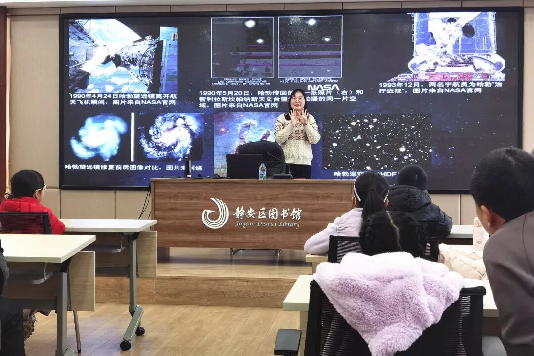 活动中,指导老师不仅为孩子们展示了“旅行者1号”拍摄的地月经典合影、木星大红斑等珍贵影像,还通过哈勃望远镜修复前后的对比画面、“创世之柱”等深空摄影作品,生动讲述了人类探索宇宙的科技历程。
