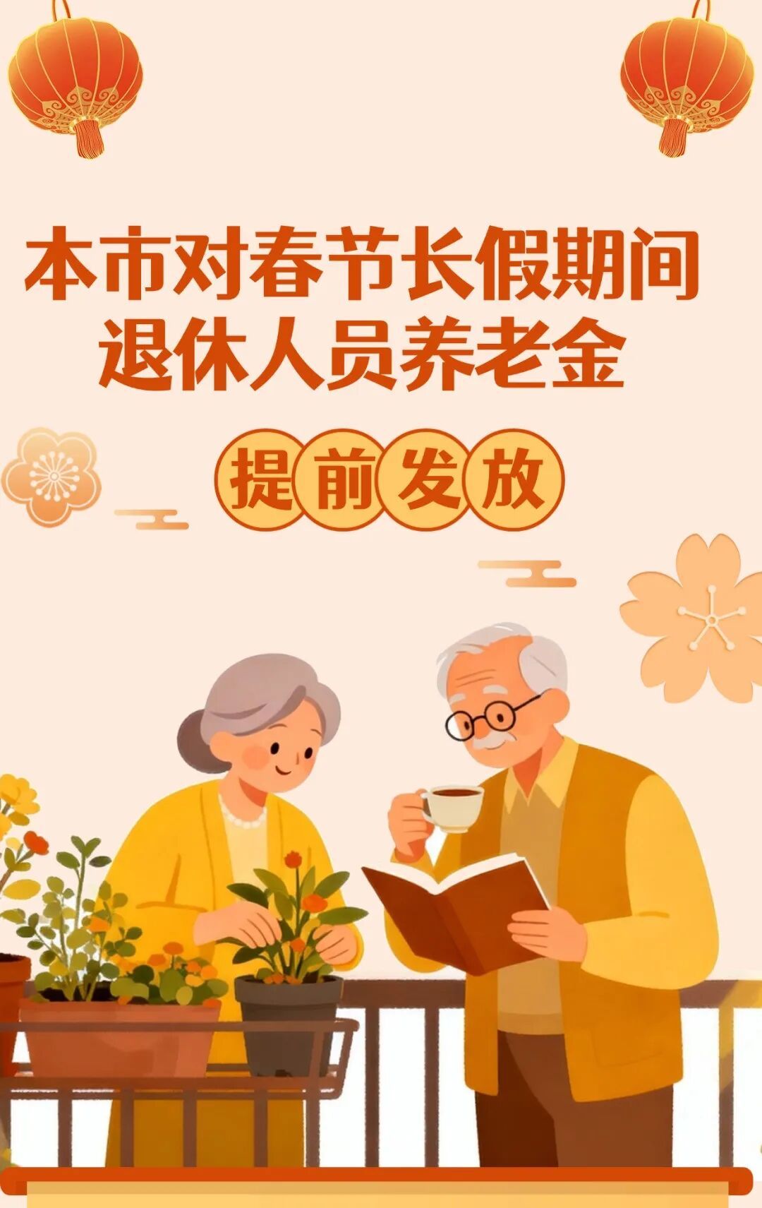 2026年2月15日至23日恰逢春节长假,市人社局将对春节长假期间发放的离退休(职)人员养老金提前发放。
