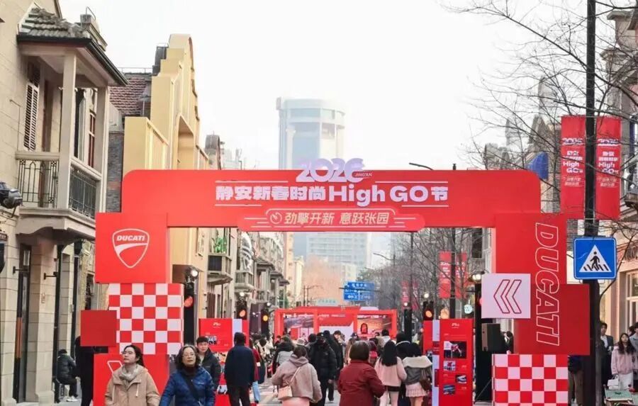 2026年,上海茂名北路。一方挥落的黑白方格旗下,红色杜卡迪机车仿若一道炽烈光影疾驰而过。首届2026静安新春时尚HighGO节启幕现场,市民游客被这机械美学的轰鸣声感染,石库门街巷瞬间化身一座没有边界的秀场。