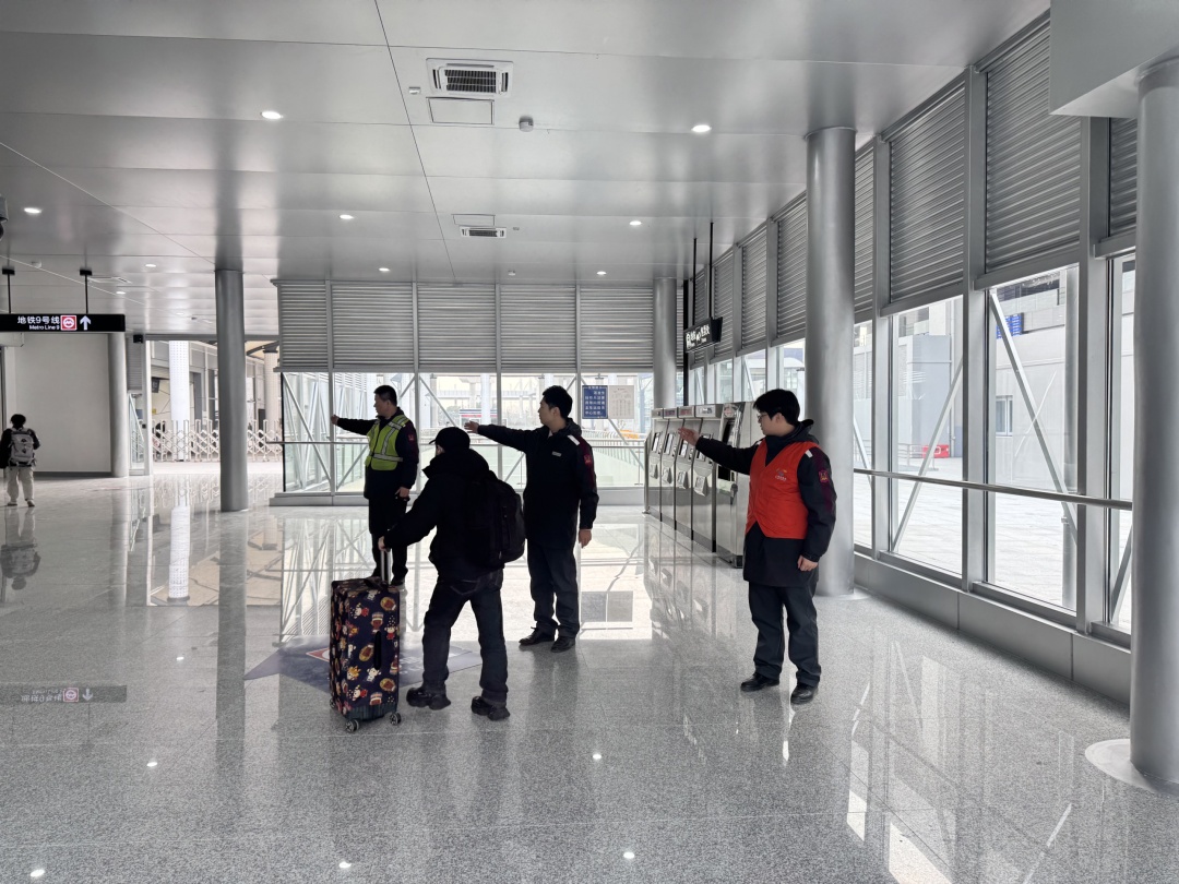 为应对工作日早晚高峰及铁路列车集中到达时段的大客流,车站在4号口免安检通道处增派一名站务员,重点加强客流、购票引导,确保现场运行平稳有序。在通道启用当日,9号线“松江百灵鸟”服务团队成员身着统一标识服装,在通道入口、分流处、转弯点等关键点位主动引导、耐心解答,精准指引,为乘客提供暖心服务。