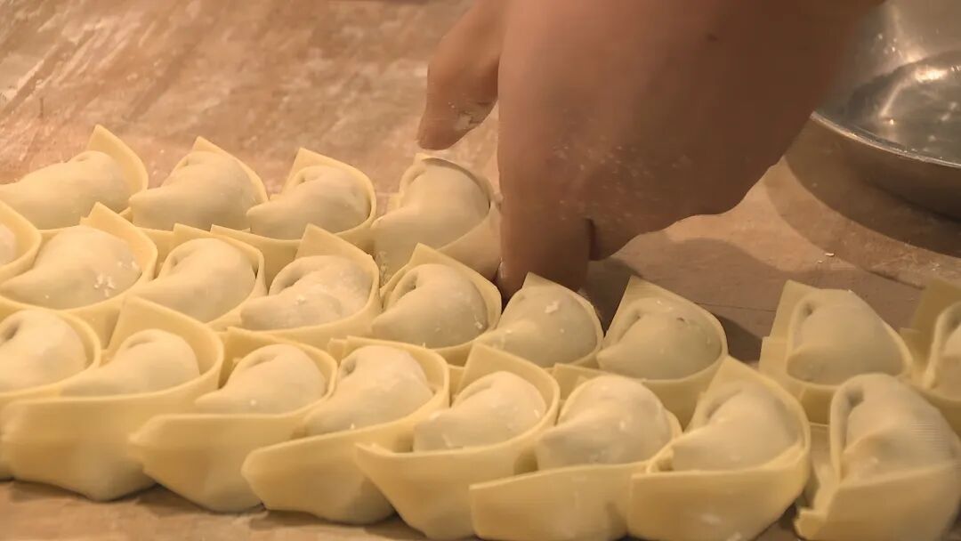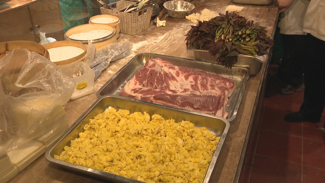 在操作间里,香椿鲜肉馄饨的食材一字摆开,鲜嫩的香椿头、肥廋相间的夹心肉以及嫩黄的草鸡蛋看着十分诱人,点心师傅正在有条不紊地细心地包着一只只馄饨。香椿头是香椿树的嫩芽,被誉为“树上的蔬菜”,含有丰富的蛋白质、维生素C、钙和铁等营养成分。