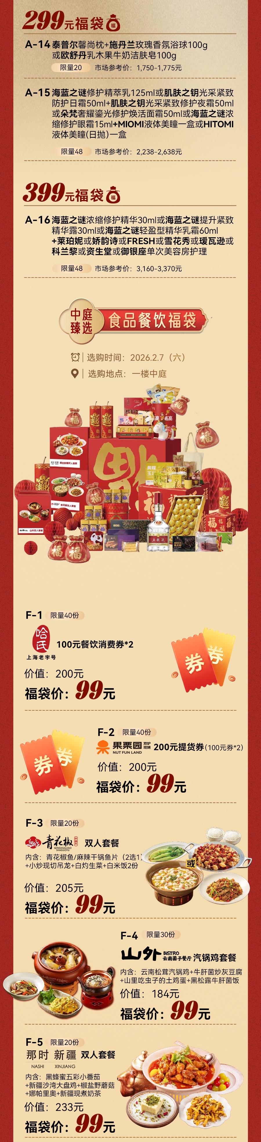 2月7日至2月8日,化妆品消费满800元赠200元现金券;黄金饰品最高立减130元/克,镶嵌类饰品5折起;2—5F女装、运动户外等品类季末折扣基础上,折后消费满1000元赠100元现金券,叠加黄浦区新春消费券、南京路迎新年消费券使用,优惠可叠加、实惠不打折,让消费者尽享购物乐趣。