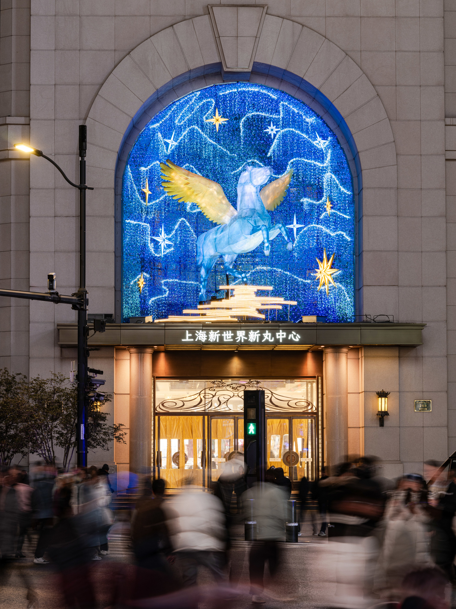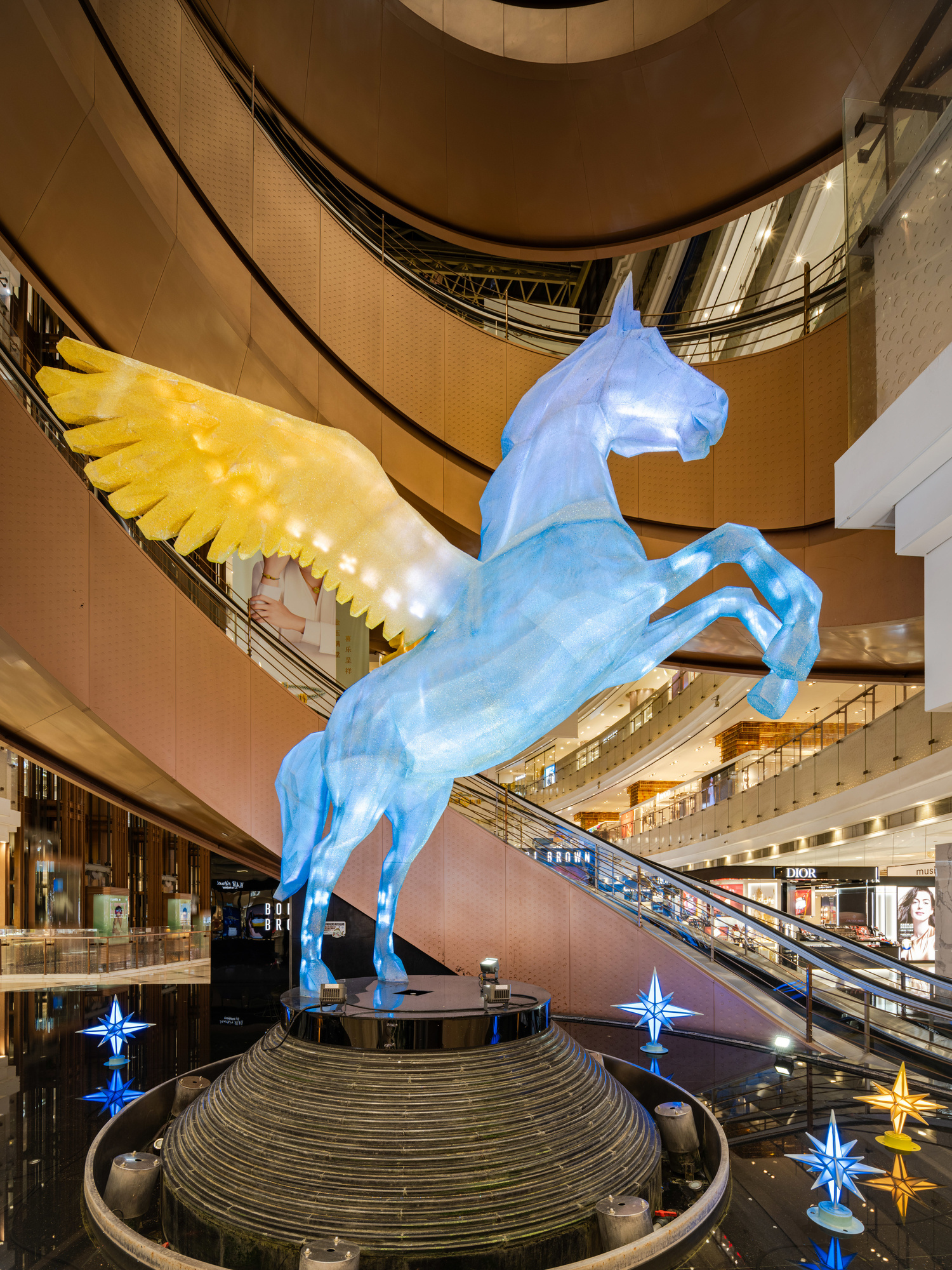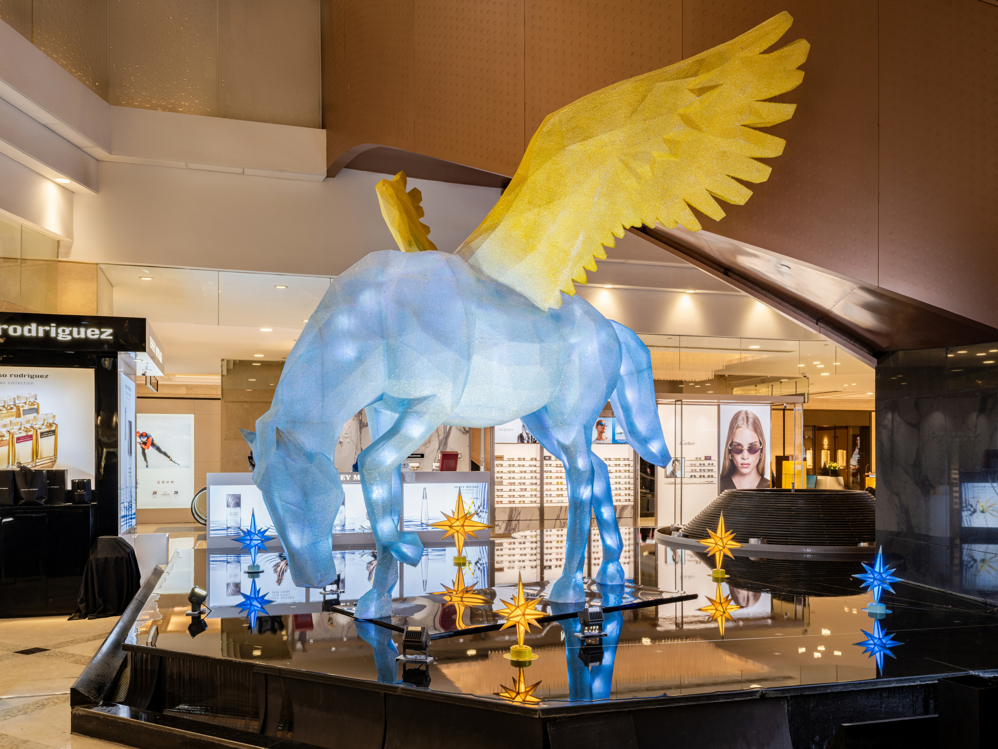 值得一提的是,商业与文化交融,为新春消费注入独特韵味。商场全新推出马年大型艺术装置《星翼丙午》,以二十八星宿中的“星日马”为原型,将古老星象符号与现代设计结合,打造兼具未来感与神圣感的公共艺术作品。该装置高逾四米,采用低多边形造型语言,主体为“星空蓝”,翅膀渐变“晨曦橙”,内置光源夜间自内而外发光,与城市霓虹交相辉映,成为沪上新年打卡新地标,让市民在购物之余,感受马年新春的文化气息。