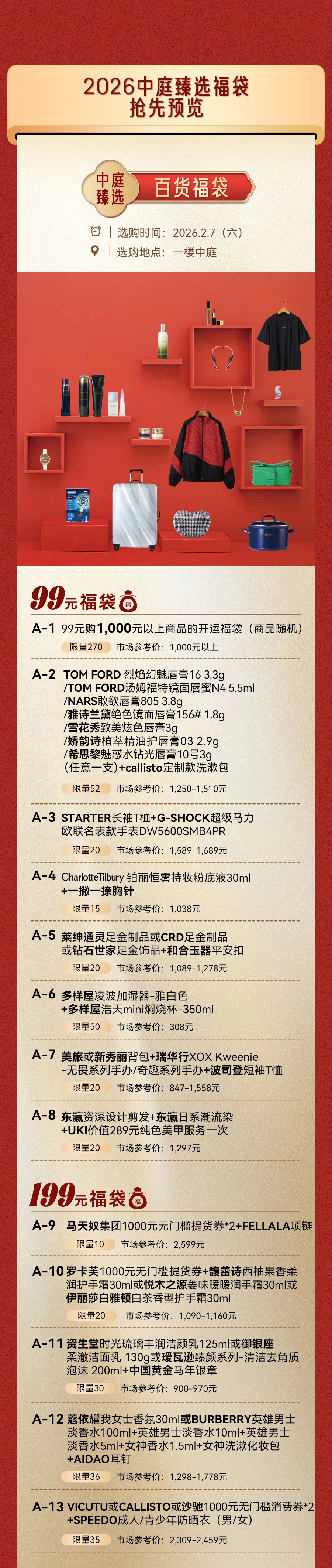除了诚意满满的福袋,活动当天的专属福利更是层层加码。凡购买中庭臻选福袋的消费者,可免费领取2026新年定制东华美钻“福运双全”足金工艺品吊坠,限量500个;会员专属福利尤为亮眼,购买单个定价199元及以上的中庭臻选福袋,即可以1499元的特惠价购买53度飞天茅台500ml一瓶,限量100瓶;此外,参与中庭臻选福袋排队的顾客,均可获赠马年限定款气球一个,限量600个。