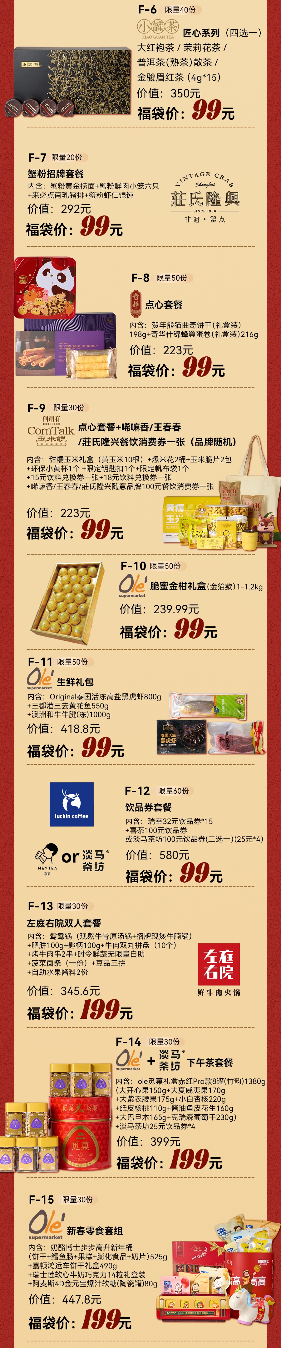 其中,食品餐饮福袋依然热门,99元档位即可解锁多重惊喜,涵盖果栗园200元提货券、小罐茶匠心系列、奇华点心套餐、Ole海陆年货套餐等,最高价值超400元;99元购千元的餐饮福袋堪称“性价比之王”,每年都“提前售罄”;299元福袋则涵盖海蓝之谜在内的国际一线化妆品;高价位福袋则汇聚更多优质好物,比如699元可购买五粮液普五八代52度500ml+小金锤经典赤霞珠干红葡萄酒750ml*2,满足不同消费群体的个性化需求。
