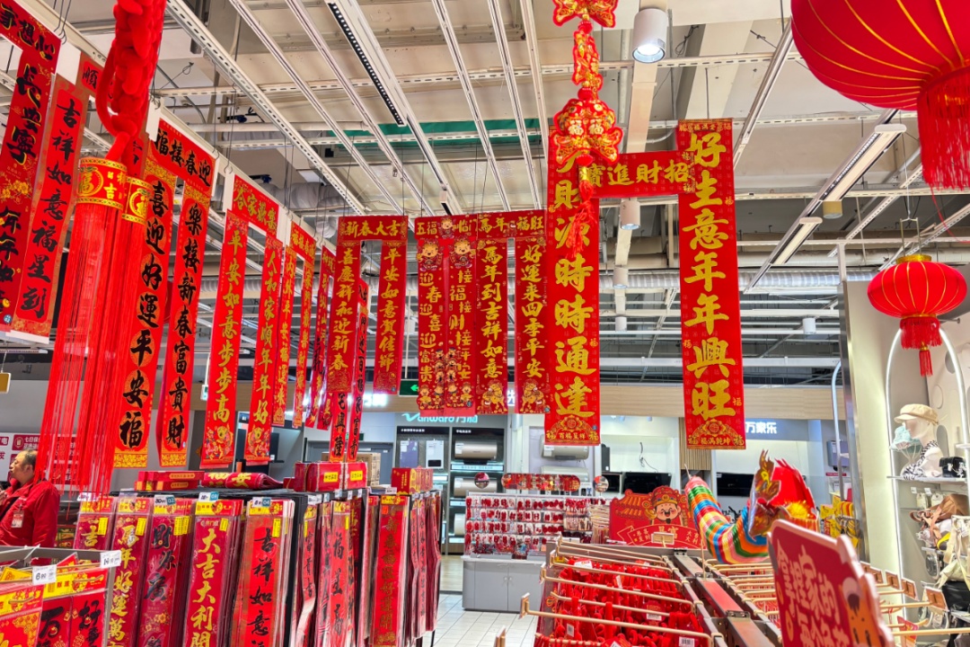 超市工作人员介绍,临近春节,带“马”元素的商品尤其受欢迎,马年包装的礼盒、玩具等成为热门选择。此外,春联、福字、红包等同样抢手,各类水果和食品礼盒也十分热销。
