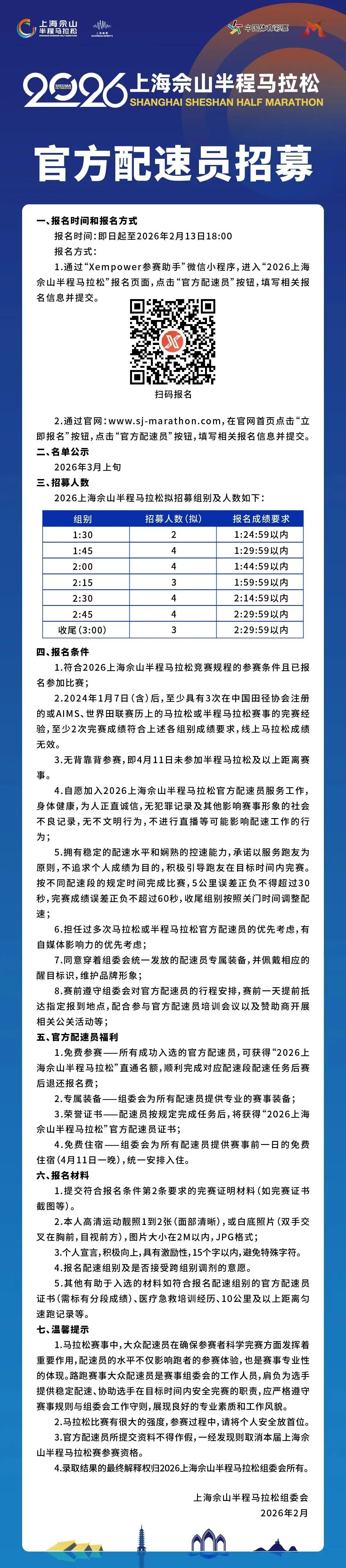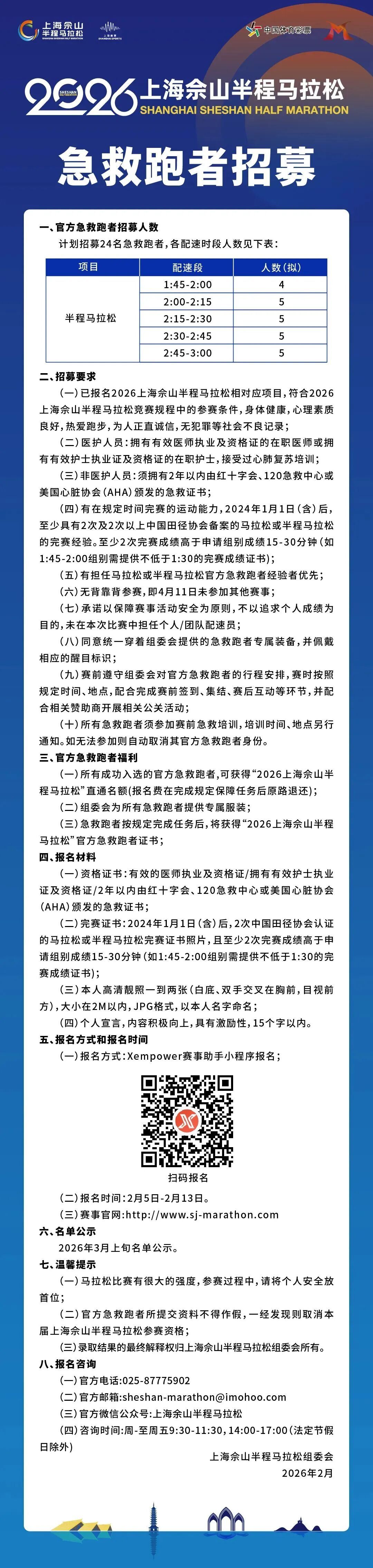 2026上海佘山半程马拉松将于4月12日开跑。目前,赛事官方配速员和急救跑者正在招募中。本届赛事拟招募官方配速员和急救跑者各24名,详情可前往“上海佘山半程马拉松”微信公众号进一步了解。