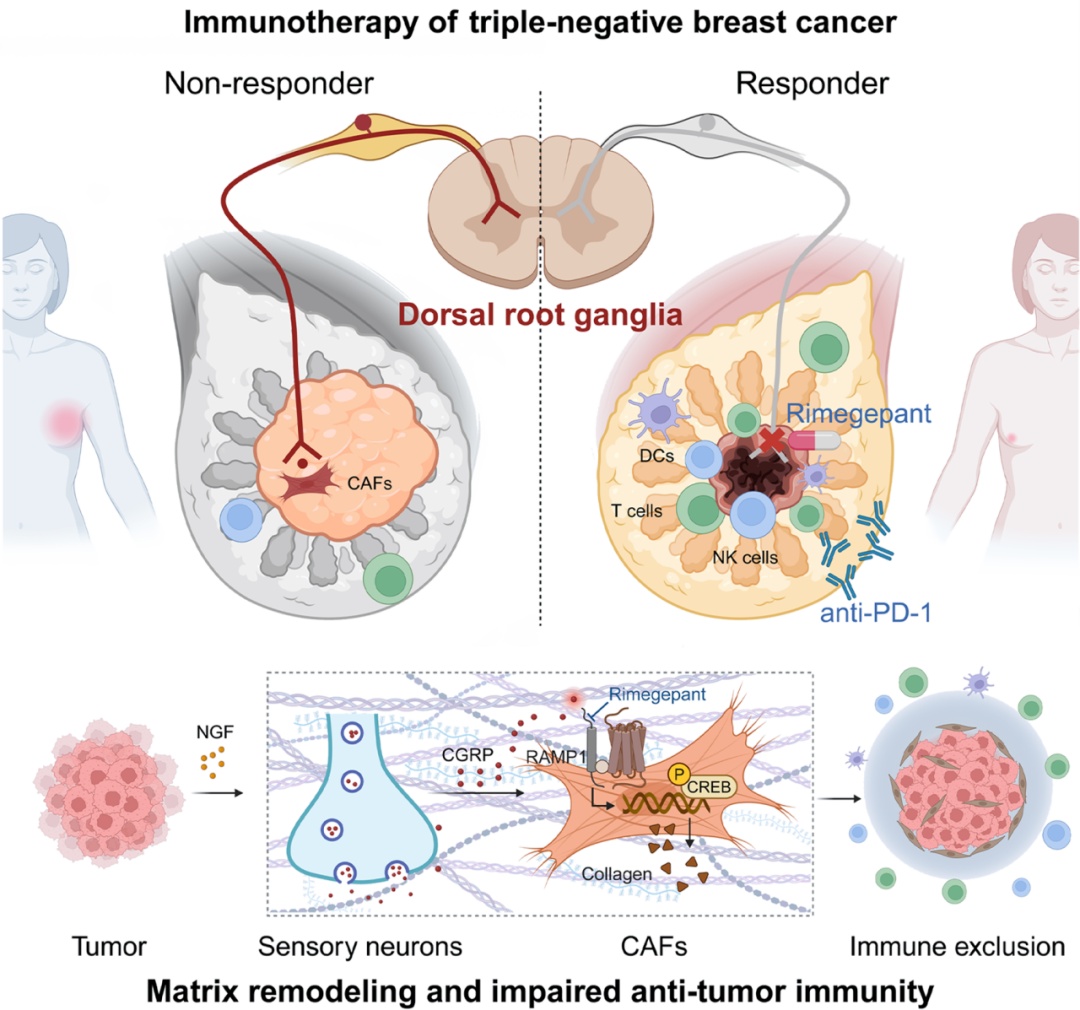 该图概括了感觉神经–成纤维细胞轴线在乳腺癌免疫治疗反应中的关键作用。肿瘤分泌神经生长因子诱导感觉神经浸润并释放CGRP,激活CAFs上的RAMP1–cAMP/PKA/CREB1 信号通路,促进胶原沉积并形成免疫排斥型微环境,从而削弱抗 PD-1 治疗效果。阻断 CGRP 受体(如 Rimegepant)可抑制该通路,改善免疫细胞浸润并增强免疫治疗反应。