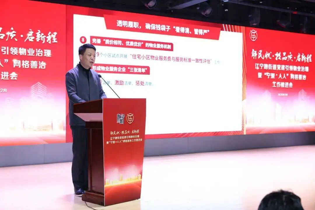 2月5日,江宁路街道举办“解民忧∙提品质∙启新程”党建引领物业治理暨“宁聚·人人”网格善治工作推进会。区政协党组副书记、副主席宋大杰出席。区委组织部、区委社会工作部、区房管局、区城运中心、区体育局等部门领导,区域化党建重点单位代表,物业治理专家,街道机关干部代表,物业公司和业委会代表近百人齐聚一堂,共商物业治理新路径,共绘网格善治新画卷。