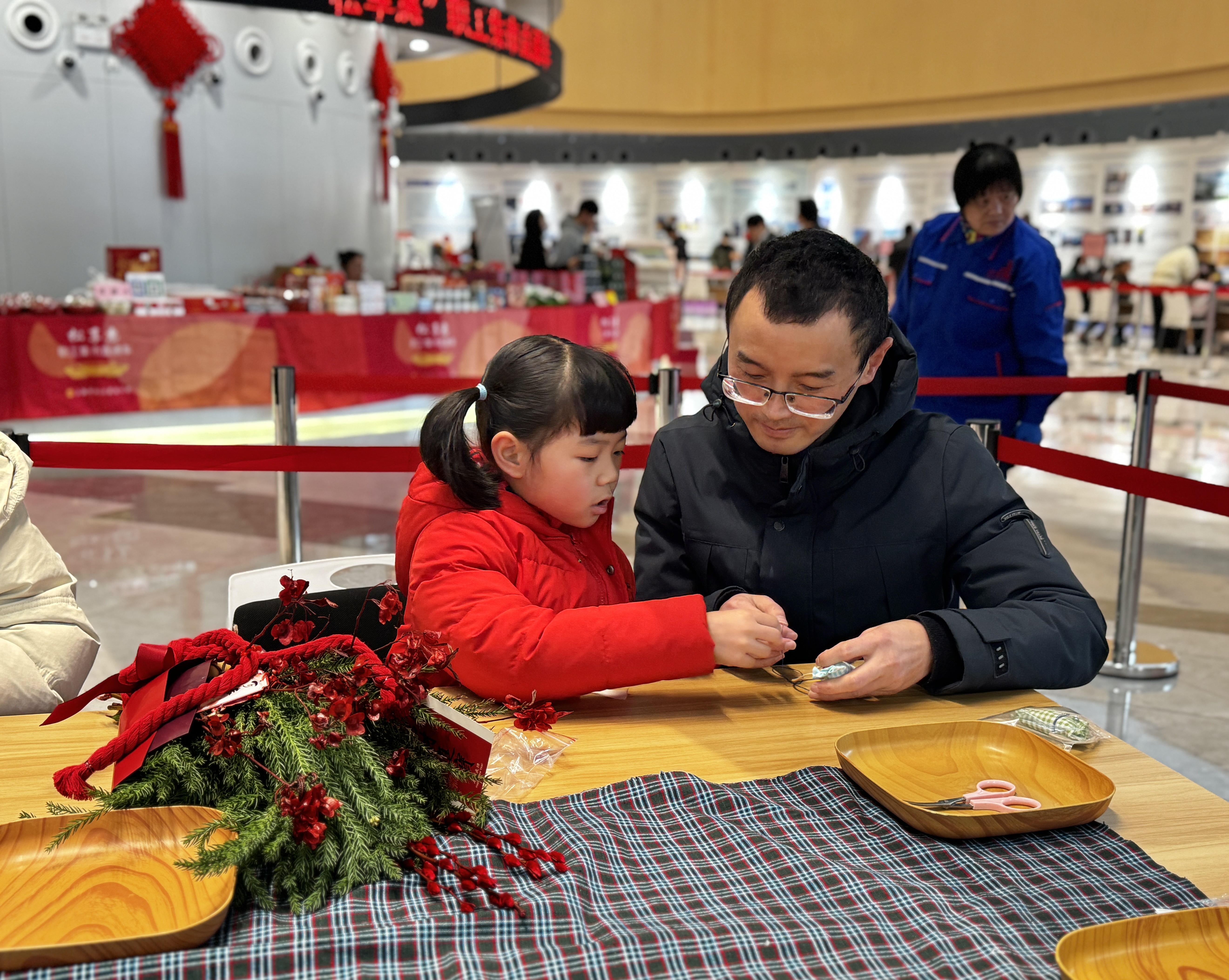葫芦挂坠、迎新挂绳、新年门挂……互动体验区域,孩子们在家长陪同下,体验民俗手工的乐趣。手工桌前,几位市民和孩子一起挑选花材,用红绳将银柳与迎客豆捆扎,制作成喜庆吉祥的新年门挂。“孩子亲手做的新年纪念品,比买来的装饰更有意义。”王磊一边帮女儿固定花枝,一边笑着说道。