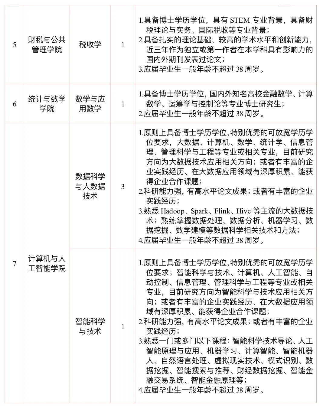高层次人才:具有高级专业技术职务,在学术界拥有一定影响力,或学校紧缺专业人才。面向会计学、财务管理、审计学、资产评估、金融学、经济学、统计学、智能科学与技术等专业,待遇优厚,薪资待遇面议。