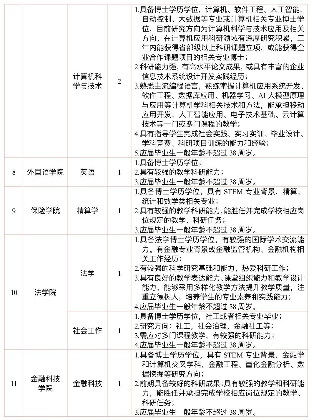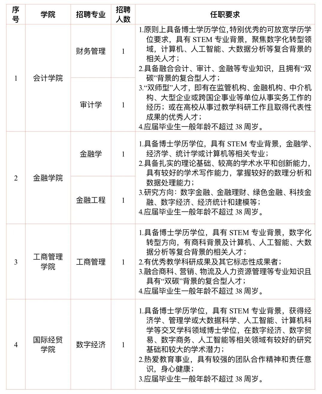 常任轨教师:具有国内外高水平大学博士学位和学术工作经历,在学科前沿领域具有较强的学术潜力,为学校高层次人才的预备培育“蓄水池”。面向海内外优秀青年才俊,专业为会计学、财务管理、审计学、资产评估、金融学、经济学、统计学、计算机、人工智能、自动控制、数据科学、马克思主义理论等专业,薪资待遇面议。