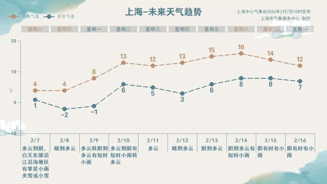 上海中心气象台预计,下周一早间本市持续冰冻体感,最低气温或将跌破0℃以下,白天开启小幅升温。下周二起,最高气温又将重新回升至10℃,下周五、周六气温回暖可达15~16℃。值得注意的是,下周一头一尾分别将迎来两次较弱的降水过程,其他大部分时间以多云天气为主。