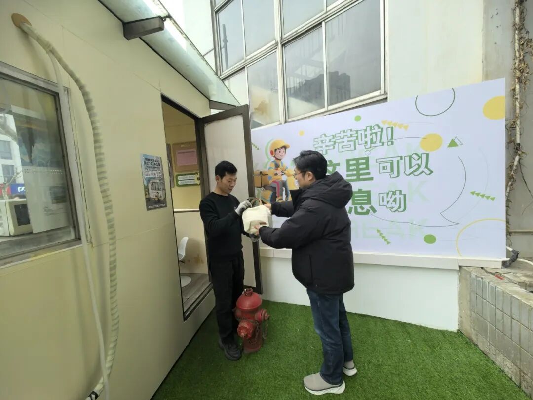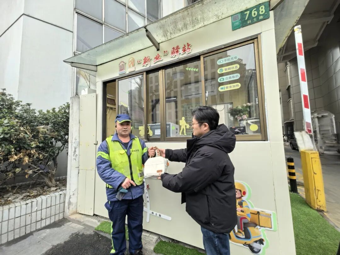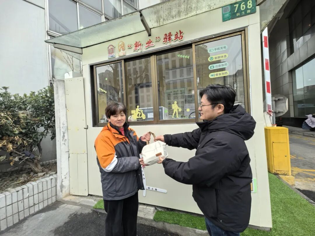 五里桥街道颐乐生活综合网格工作人员来到位于打浦路上的“颐路顺沣·骑手驿站”,为忙碌的快递员、外卖骑手及其他户外工作者送上驱寒姜茶和精心准备的“暖心包”,包内有实用的防寒手套和便携饭盒,让小哥们在冬季跑单时不再感到“手冷”,不再难就餐。