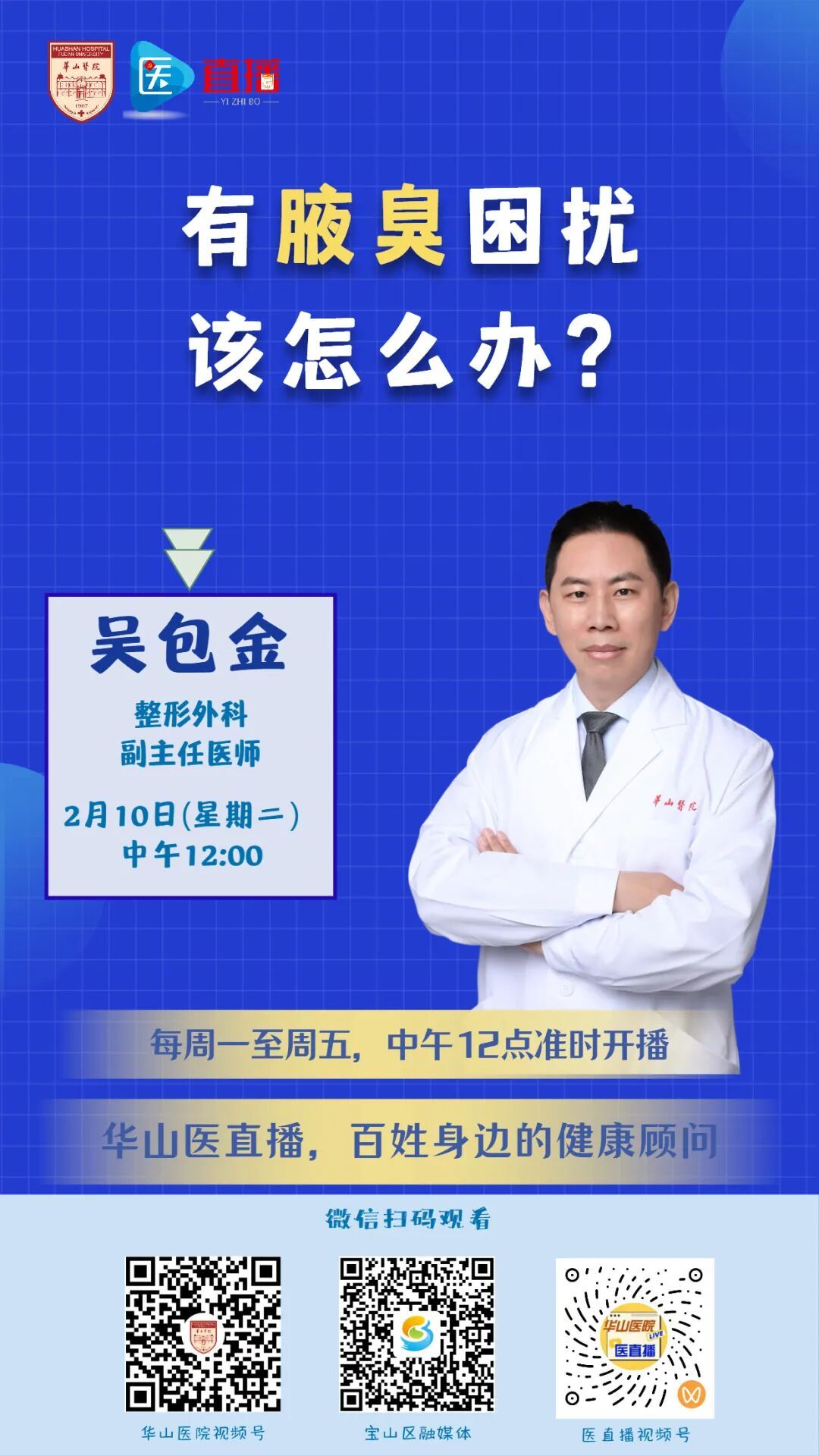 你是否曾因腋下特殊气味而感到困扰?其实,腋臭并非难题。本期医直播,复旦大学附属华山医院整形外科副主任医师吴包金将以轻松、科学的方式,带您了解腋臭的成因与解决方案,重拾清爽与自信。
