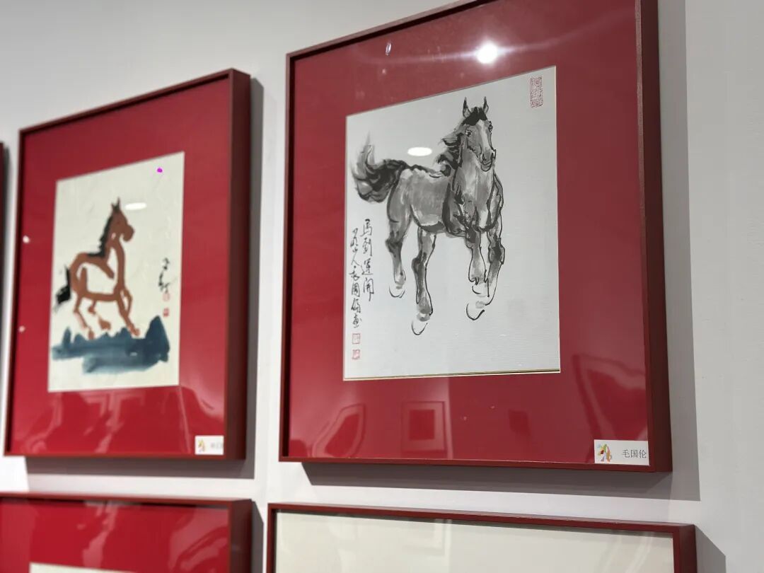 80后青年艺术家黄朝青的2幅作品正在展出,红纸的背景下,一匹马儿昂首挺胸,踏着花路前行,整幅画面熠熠生辉,带着朝气和希望。“今年自己40岁了,总会想起更年轻的时候。”凭着心中的感慨,黄朝青便以“春风得意马蹄疾”这句名句为灵感,创作了这幅作品。