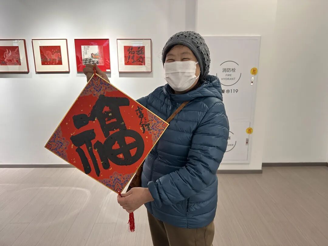 听闻此次活动信息,古美摄影爱好者刘老伯不顾下雨,如约来到活动现场打卡。“特别喜欢,要放到家里最显眼的位置!”刘老伯收到福字后,开心地和艺术家李钟合影留念,随后还特地找到了李钟的展出作品,仔细观看欣赏。