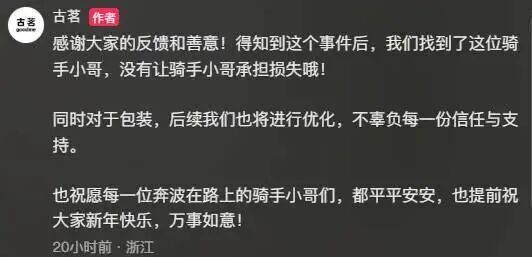 古茗官方也通过社交账号回应称,得知这起事件后,已找到了这位骑手小哥,没有让骑手小哥承担损失。同时对于包装,后续也将进行优化。