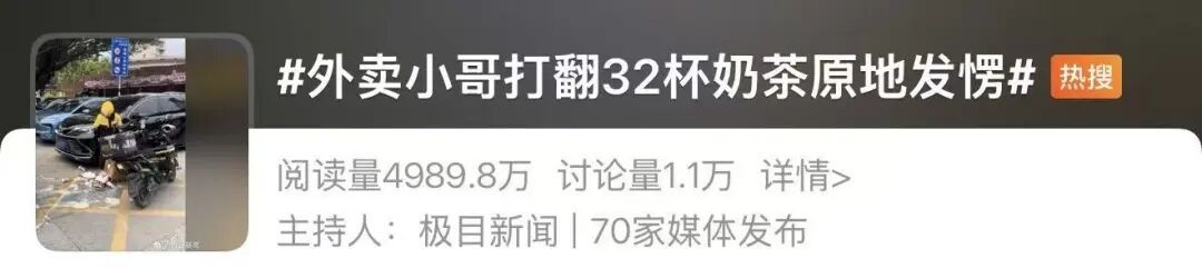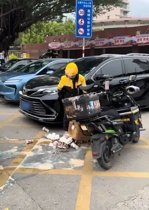 视频里,装奶茶的纸箱倒在地上,多杯奶茶从纸箱中摔出,液体混着珍珠、椰果洒了一地,外卖小哥显得无奈又沮丧。