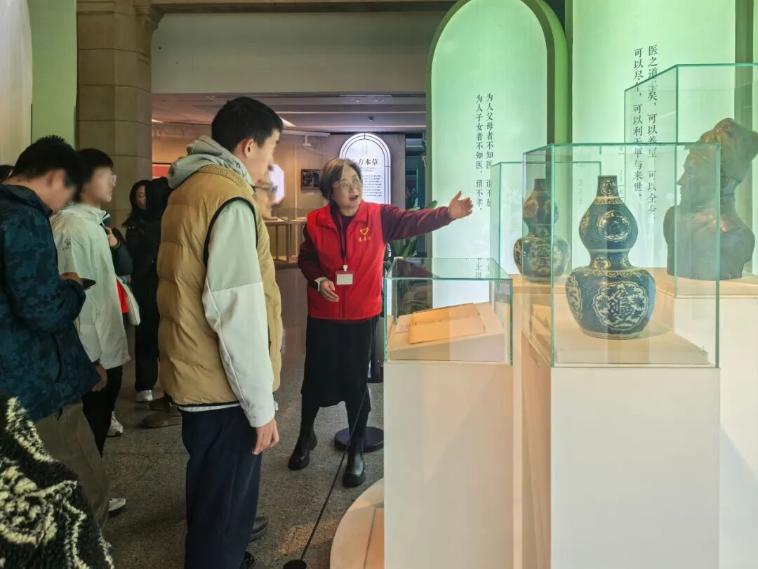 尽管室外寒意凛冽,博物馆展厅内却是一片温馨景象。孩子们在志愿者与家长的陪伴下,走进以江南园林意境打造的中医文化空间。展柜中陈列着古旧医书、精致药具与各类药材标本,海上中医的历史脉络在灯光下缓缓舒展。志愿者生动的讲解,让原本深奥的“阴阳调和”“本草药性”化为贴近生活的常识。对许多家庭而言,这不仅是一场展览,更是一次与传统智慧的温柔初遇。