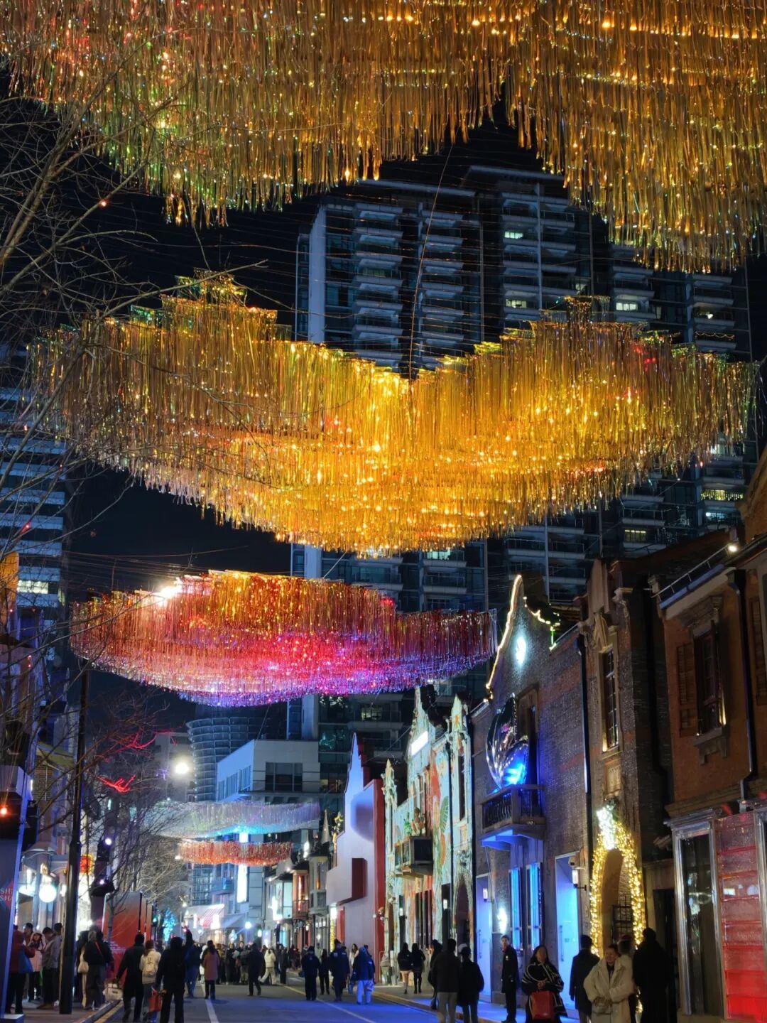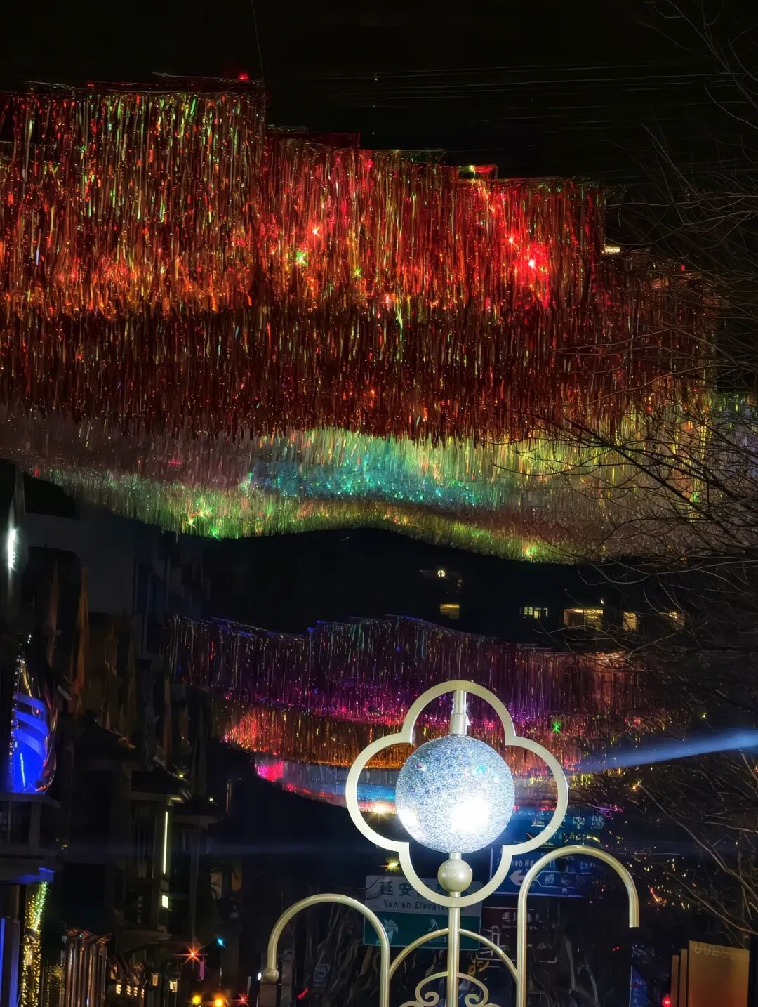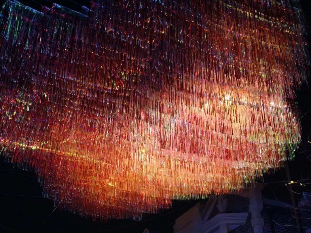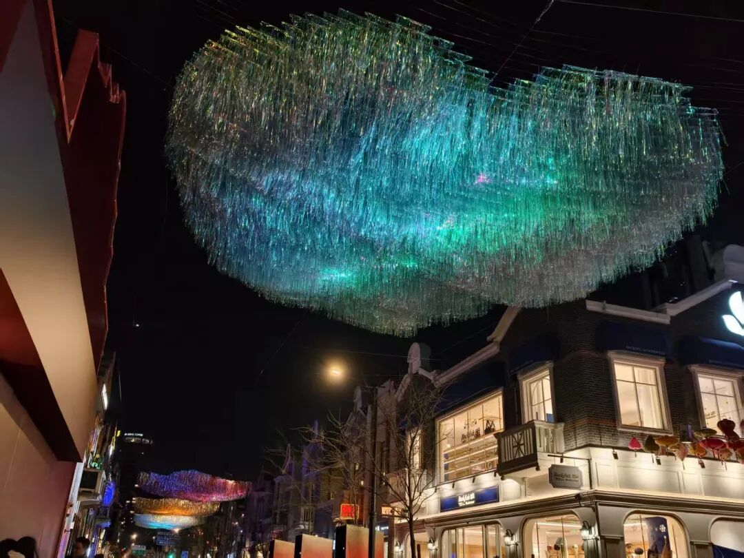 这便是近期社交平台上刷屏的“主角”!白天,镭射流苏垂坠随风轻舞,在阳光照射下呈现斑斓光影与动态闪烁效果;夜幕降临时,中国传统的葫芦、寿桃、方胜、银锭、海棠等吉祥纹样,汇以新颖的材料和光影技术手段,让这个作品在白天和夜晚形成不一样的精彩。风,成为了最好的画师,让这些吉祥祝福在行人头顶流淌、闪烁,形成一条动态的、可穿行的光影祝福廊道。走过这里,便是承接了一整年的好彩头。