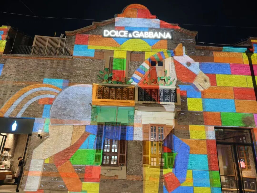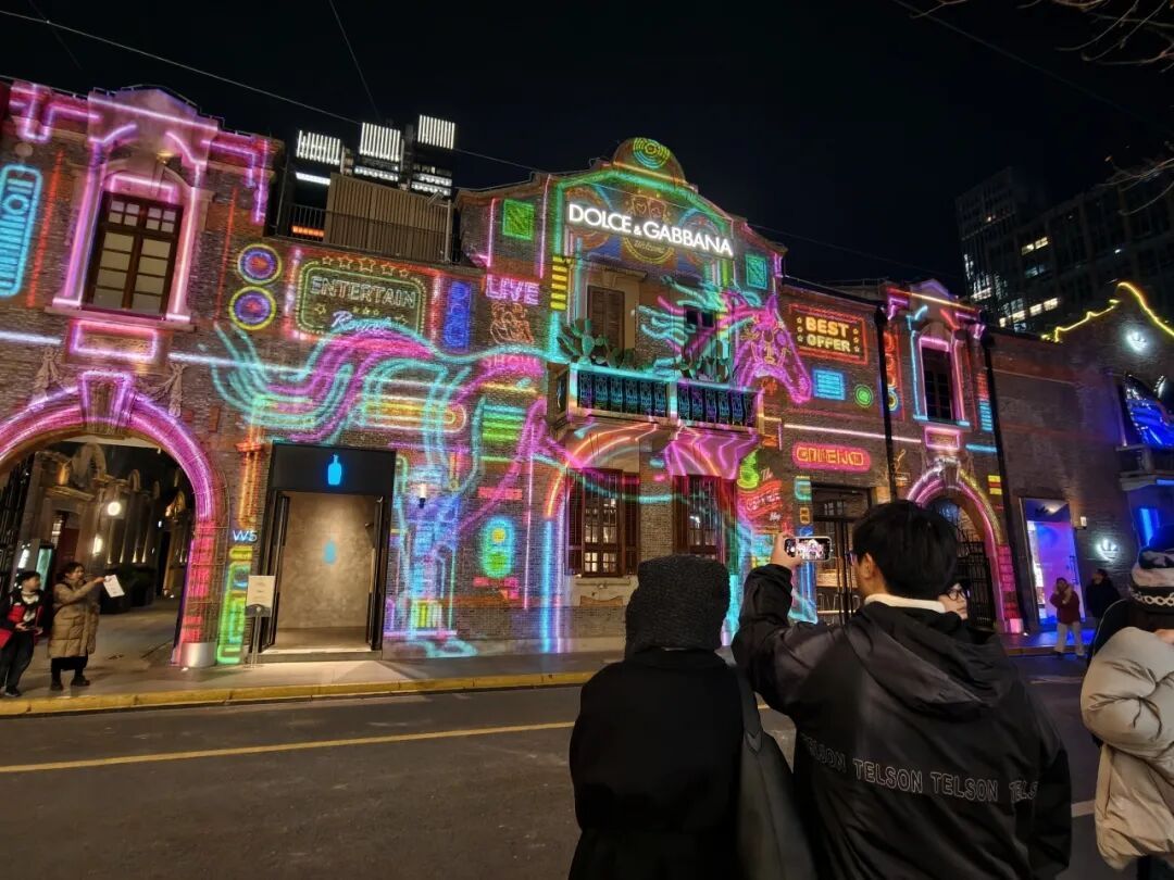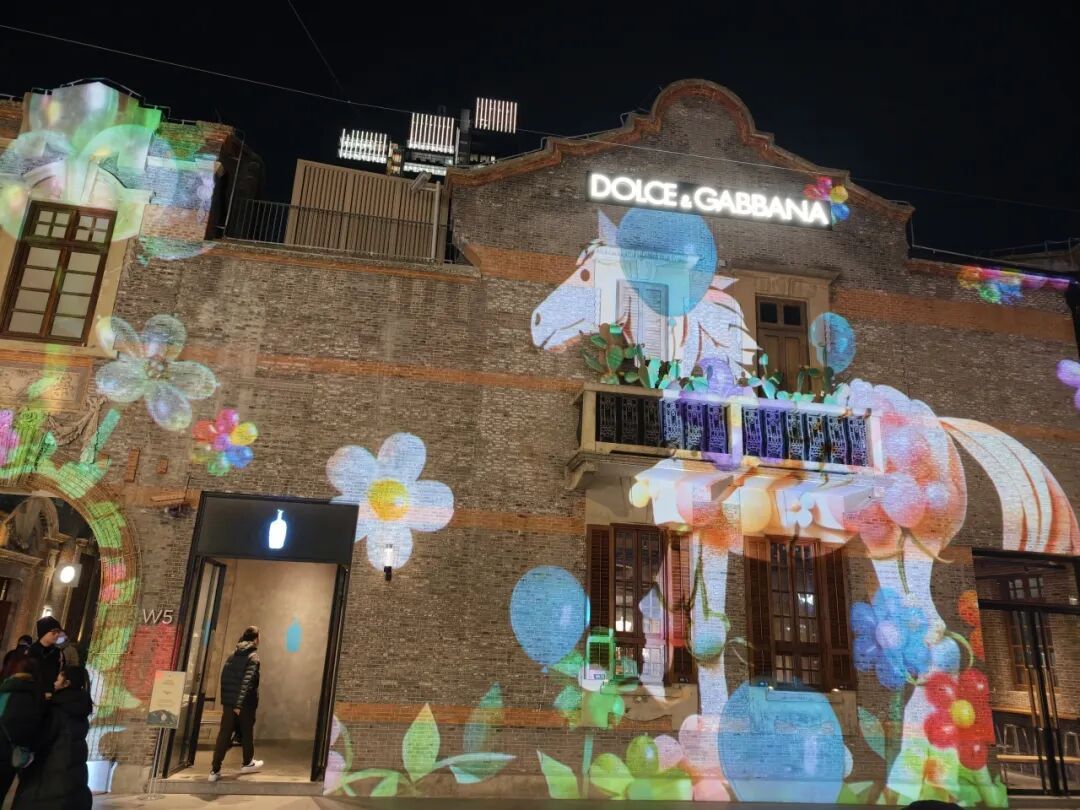 如果说《天河奔马》是轻盈的序曲,那么在石库门外墙上演绎的《一马当先》数字光影秀,则是一场磅礴的视觉交响。联动徐悲鸿美术馆,以徐悲鸿《奔马图》《群奔图》为创意原点,打造核心数字内容,呈现非遗文化和新春氛围。六匹飞驰的骏马从悲鸿画作之中飞驰而出,穿越过一个个缤纷多样的奇异时空,色彩与笔触构成的东西并映融合时空,缠枝花卉与温暖毛毡交织的美好时空,未来时空与星河霓虹连接的绚烂时空……凡此种种,天马行空,奇思妙想,祥和美好,带来最原汁原味的马年体验。