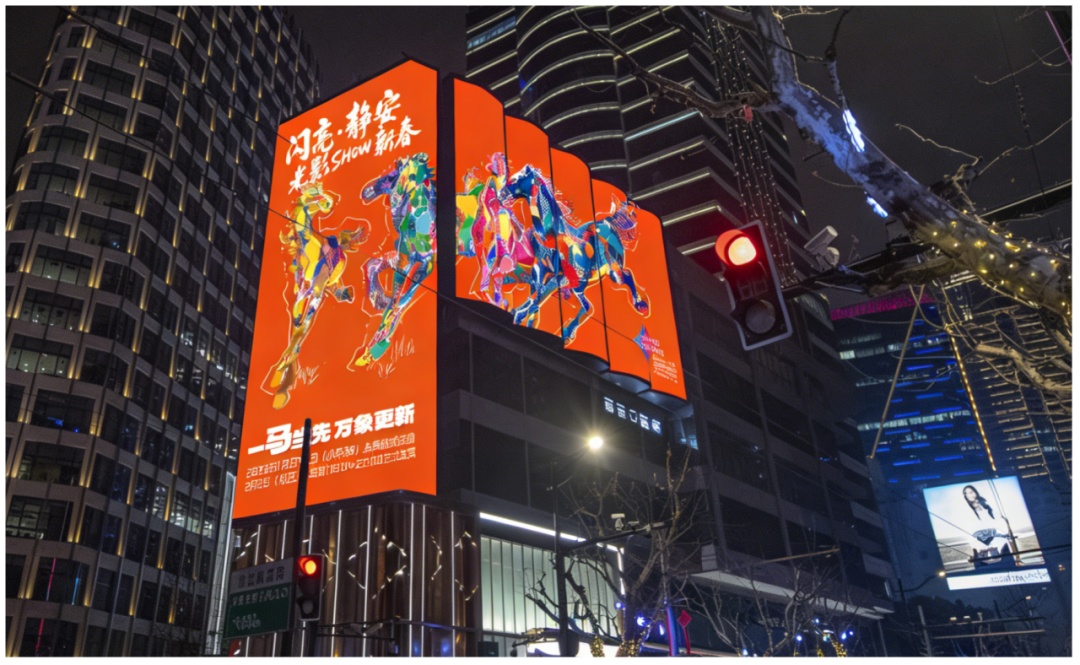多个巨幅屏幕将播放活动联动悲鸿作品所创作的光影奔马的贺岁影片,让市民游客漫步静安能随时随地都能感受亮丽的城市天空。