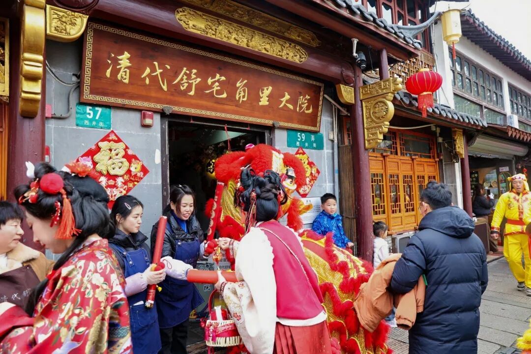 金黄与朱红相间的长龙随鼓点腾跃翻转,气势非凡;灵动的狮子摇头摆尾,憨态可掬,不时探头与路边商户互动,引得阵阵欢笑。紧随其后的腰鼓莲湘队步伐铿锵,手中的莲湘棒上下翻飞,二胡、竹笛、琵琶等传统乐器奏响婉转曲调,将江南丝竹的韵味洒满长街。
