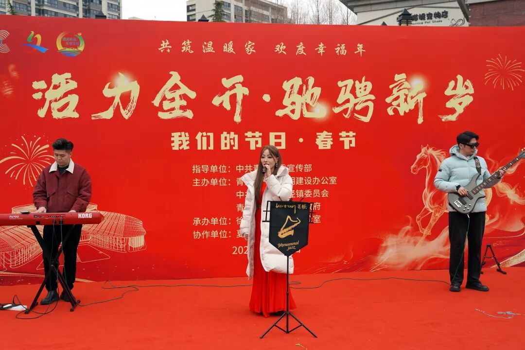 在盈浦街道桥梓湾广场分会场,铿锵有力的《腰鼓迎宾》将现场气氛瞬间点燃。随后,精彩节目轮番登场:表演唱《新年快乐》唱响喜悦,萨克斯合奏《走进咖啡屋》带来复古浪漫,街舞串烧《钻石少年》点燃青春激情;盈浦故事《未尽的渔歌》以乡音讲述水乡记忆,越剧选段《啼笑姻缘·幽会》婉转动人,经典红歌《我的中国心》更引发全场共鸣。 四大体验专区更是人气爆棚,年味十足。“民俗嬉春”区内,剪纸、捏面人、糖画等非遗摊位前排起长队,书法爱好者现场挥毫送福;“年货品春”区汇聚了桥梓湾商户精选的各式年货;“亲子闹春”区设置的投壶等传统游戏,吸引了众多家庭参与;“名医护春”区则为居民提供了贴心的健康咨询服务。