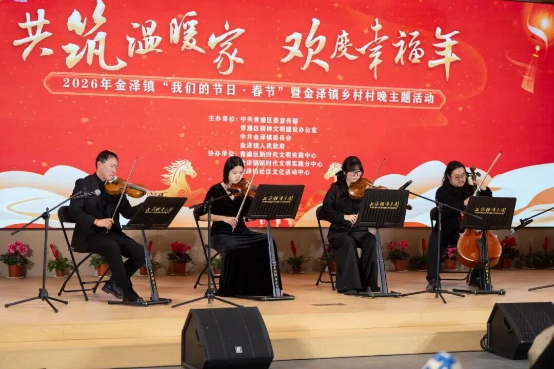 在金泽镇西岑社区封漾里分会场,百余名在新春佳节来临之际依然坚守一线的西岑科创人才、科创中心建设者及其家属欢聚一堂。 活动现场,“做圆团”“焋糕”等金泽特色非遗摊位前人头攒动,写福字、挂灯笼营造年味浓浓,迎新春心愿墙上写下新年祝福,祈愿新岁序开,一马当先。弦乐、魔术、戏曲串烧、脱口秀、歌舞秀等精彩节目轮番登场。由上海轻音乐团带来的弦乐四重奏《新春乐》《在水一方》《蓝色多瑙河》轻快优雅;2018年上海达人秀才艺比赛金奖获得者单滨带来魔术《千变万化》奇幻绝妙;独唱《我的太阳》《灯火里的中国》、对唱《醉美金泽·逐光行》歌声悠扬;脱口秀《爆笑新春》让人捧腹;南京市歌舞剧院上演歌舞《追梦新时代》热情奔放,一个个节目接连不断,营造出温馨浓厚的年节氛围。