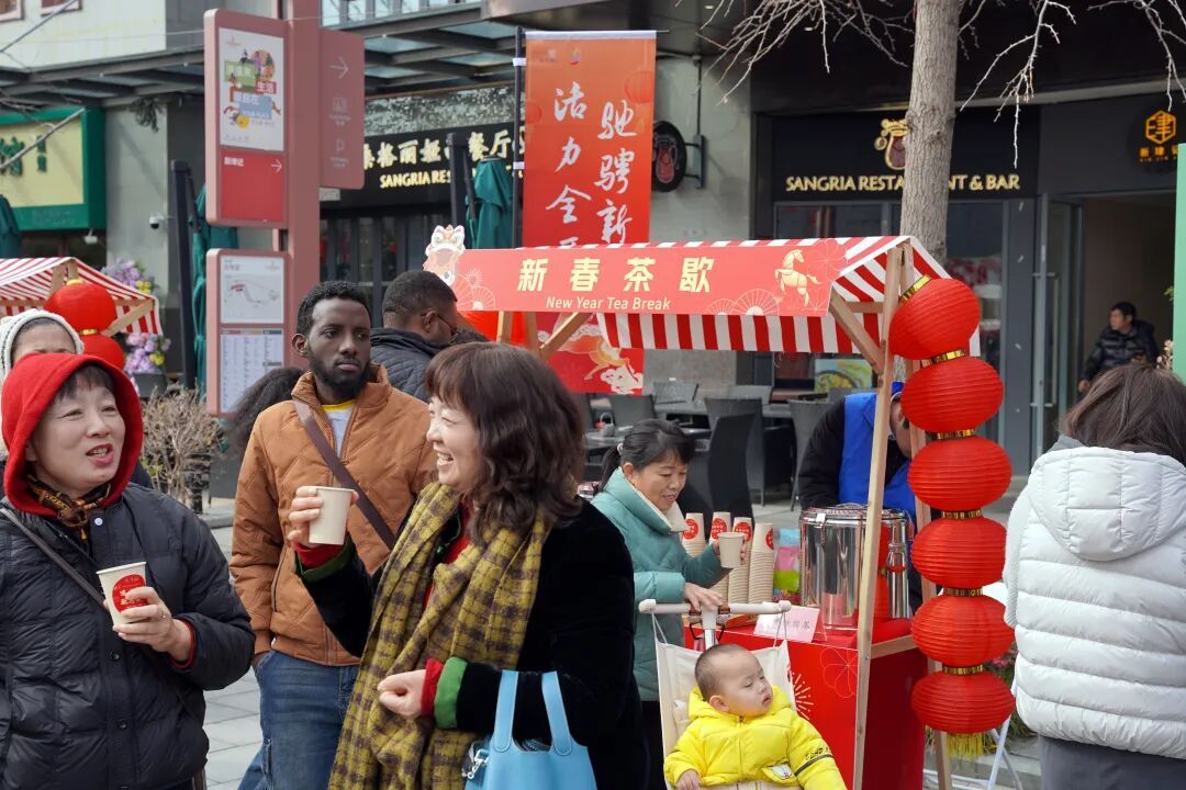在徐泾镇夏都小镇分会场,张灯结彩、暖意融融,传统年俗与国际风情在此碰撞交融,中外居民在这里共享中国年,让这个国际化社区的新春佳节,既有东方年味的醇厚,又有开放包容的鲜活,营造出欢欢喜喜过春节的浓郁氛围。 活动现场浓郁的东方年韵扑面而来,“祥瑞迎春”文化体验区内,书法爱好者提笔蘸墨,红纸黑字的春联福字一气呵成;非遗代表性传承人指尖翻飞,剪刀落下便是灵动剪纸,彩绳缠绕就成精致中国结,糖画师傅舀起糖稀手腕轻转,栩栩如生的糖画瞬间成型,引得大人小孩纷纷围拢观赏、动手体验;CNS展示区的中式服饰换装更是人气爆棚,不少外籍家庭换上唐装、旗袍,对着直播镜头向大家挥手拜年。