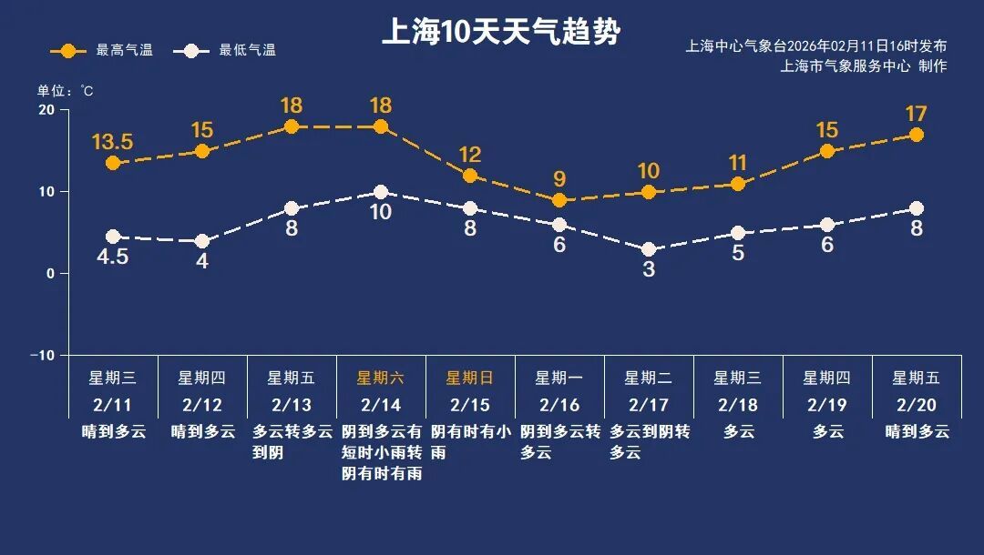 受短波槽活动影响 周五云系增多 周六、周日的雨会相对明显一些 雨水没有影响大回暖的节奏 周五、周六的最高气温直冲18℃附近 小阳春体感上线 周日至下周一 受冷空气影响 上海又会出现一次大风降温天气过程 下周一全天气温仅6~9℃之间 下周中期 多云为主 气温又会逐日回升 临近春节假期 提醒市民及时关注天气变化 合理安排生活及出行
