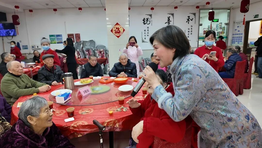 同步举行的新春联欢会上,掌声与欢笑声此起彼伏。护理员们自编自导的小品妙趣横生,逗得老人们前仰后合;经典老歌联唱引发全场大合唱,歌声里流淌着岁月的温情;双人舞环节,长者与护理员默契共舞,旋转的衣角扬起欢乐的弧度;互动小游戏更是将气氛推向高潮。
