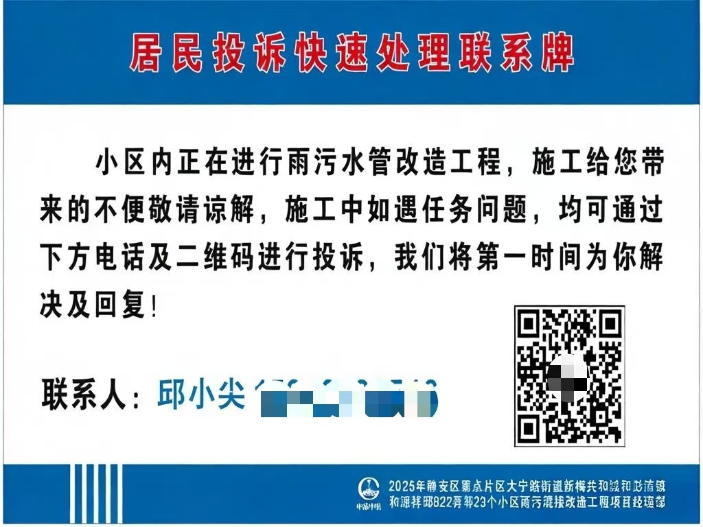 工程改造前便成立文明施工管理小组,配备专职文明施工专员,与居委会、业委会、物业建立联动机制。小区设立专属居民联络专员,开通24小时服务热线,在施工现场醒目位置张贴居民投诉快速处理联系牌,同步公示意见反馈二维码,居民扫码即可实时反馈问题、查询施工进度。建立“收集-研判-处置-反馈”全闭环机制,所有诉求做到“当日问题、当日回应”,同时严格执行“居民投诉零争吵”制度,由项目负责人专门协调,实现事事有回音。
