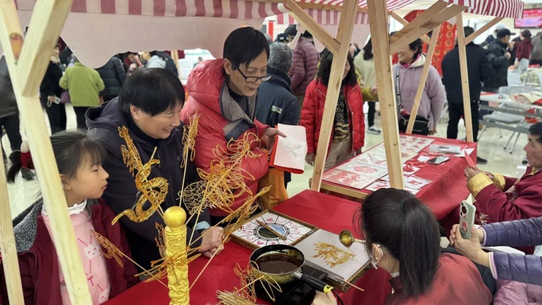 剪纸区域里,红纸翻飞,剪刀起落,艺人巧手雕琢出寓意吉祥的生肖纹样,居民们把精巧的年味与美好的新春祝愿一同带回家。面人师傅的手边更是热闹非凡,五彩面团在揉、搓、捏、粘、剪、压的连贯动作里被赋予生机,转瞬之间,憨态可掬的生肖面人便栩栩如生。吹糖人则唤醒了老辈人记忆里的经典年味。手艺人将温热的糖稀揉匀,捏成中空的糖管,居民亲手参与吹制,圆滚滚、甜蜜蜜的生肖糖人甜在嘴里,暖在心里,这份独特的滋味,牵起了几代人的童年回忆。